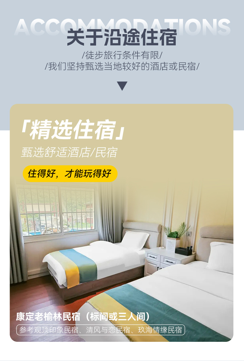 ②老榆林村民宿标间或三人间1晚(注:默认同性拼房,双人报名优先安排标间或者大床房,单人报名优先拼房,如出现单人情况则安排三人间,如需单住需补差100元/人)。