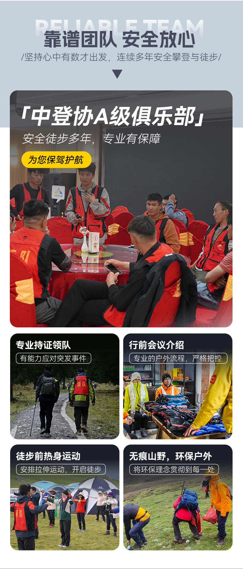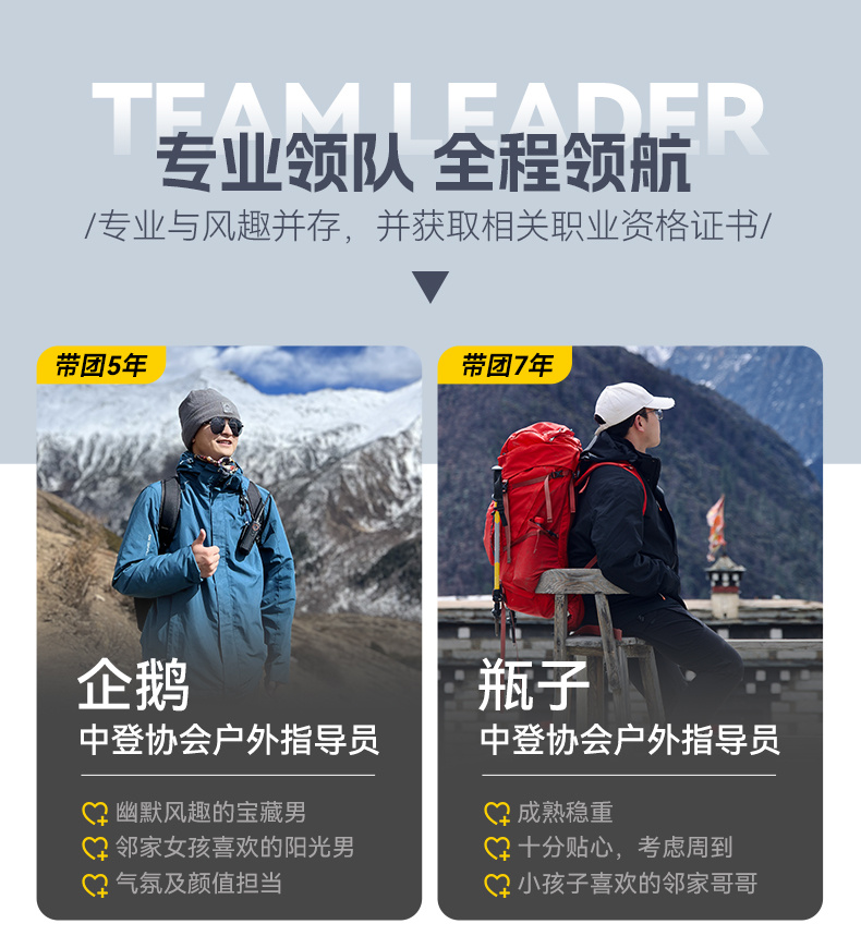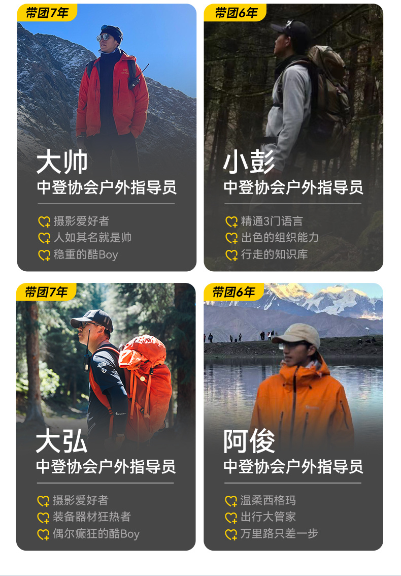 4.领队:户外专业认证(持证)领队,领协比1:8。