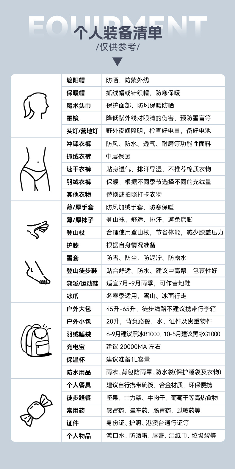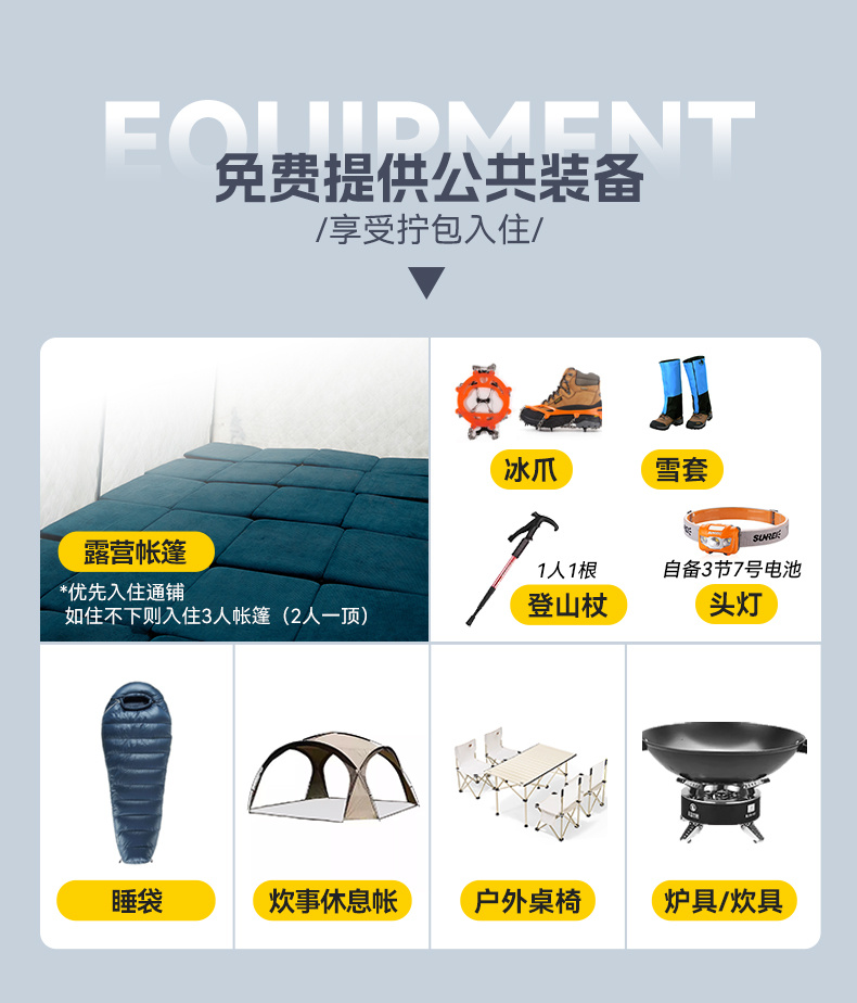 6.装备:燃料、炉具、炊具、部分餐具、通讯工具等。