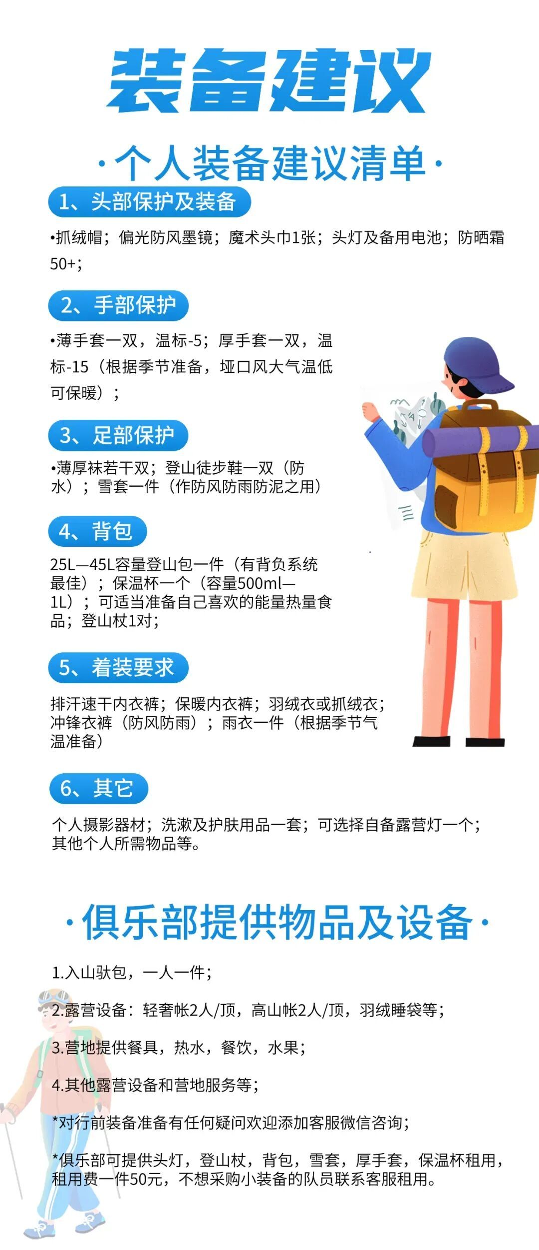 餐:营地早餐;徒步午餐自备干粮;晚餐庆功宴