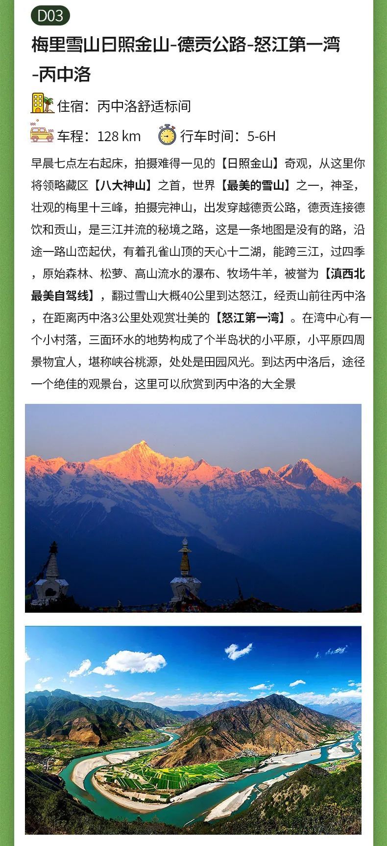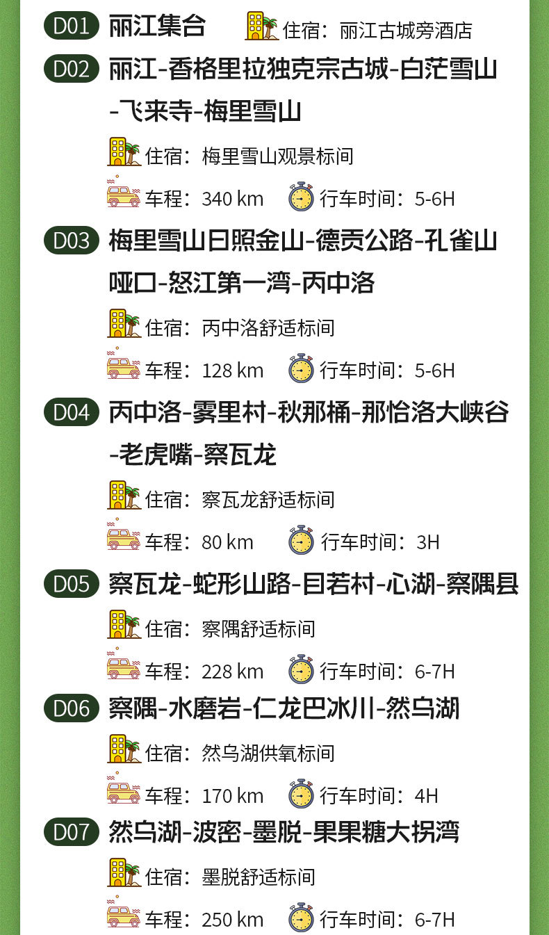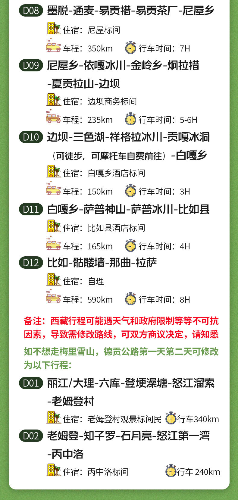此路线为丽江也可香格里拉出发,是进藏路中海拔最低的一条,有较长的身体适应期,我们会随车准备好氧气瓶或者氧气袋,高原地区旅行经验较少的可以提前一周服用高原安,红景天等,也要保持足够的睡眠时间,行程中勿过度饮酒,如有过大型手术经历,或者严重的高血压患者,不建议参加此路线