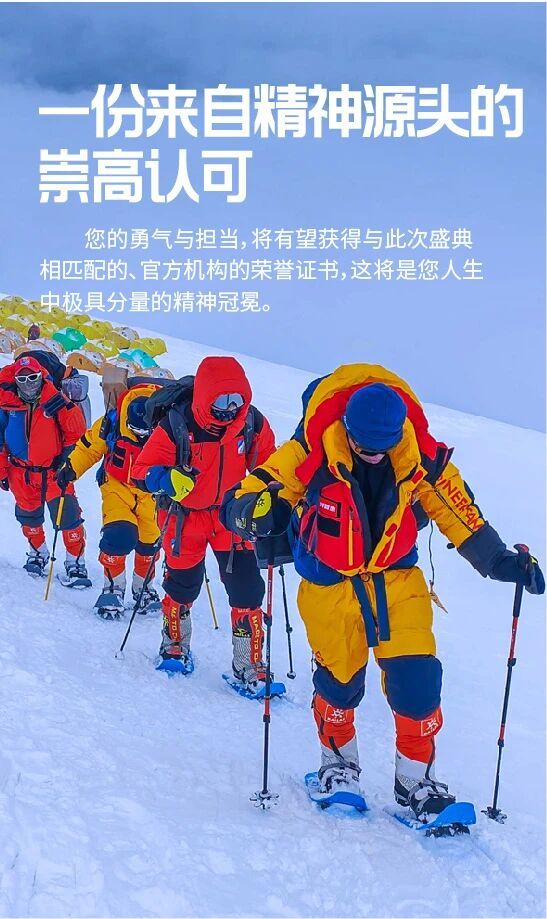5、女士登顶可申报国家一级运动员荣誉称号,男士登顶可以申请国家二级运动员荣誉称号(登顶后由组织登山方统一办理)