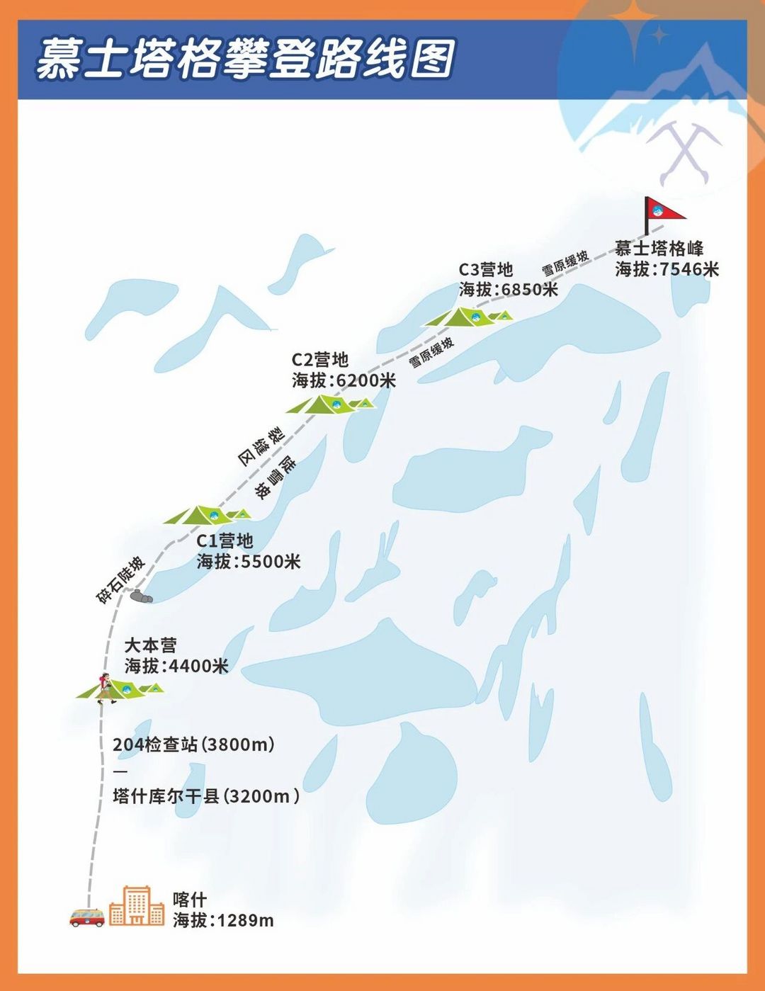 穆士塔格峰西山脊攀登路线非常成熟,坡度相对平缓,初级技术型山峰,每年都会有大量山友前去攀登。所以穆士塔格也适合作为山友们攀登7000米级山峰的首选,同时也为意在向海拔8000米以上的高峰发起挑战的登山者进阶训练的难得场地。