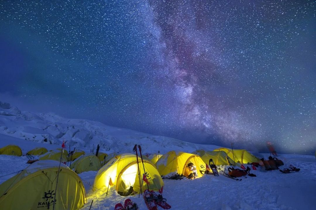 4. 1号营地(C1):海拔5300米,80% 路段为碎石路面、20%冰雪路面,坡度15-25 度。一般从大本营到1 号营地需3-4 小时。在C1-C2 行程中,海拔5700 - 5900 米是裂缝区,冰壁林立、裂缝交错,应缓慢谨慎;还有一些暗裂缝,需要沿着别人的脚印行走;海拔5620米附近的雪坡易发生滑坠,且此处路线距冰川断崖很近,一旦滑坠,有掉进崖谷的危险,因此这路段的上升、下撤都要十分小心。