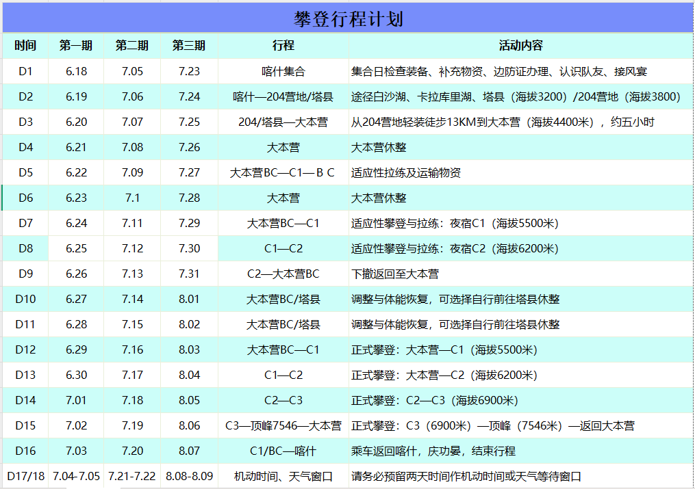 起始时间不变,攀登、结束日程则会根据实际行程和天气原因进行调整,请务必按行程计划预留两天机动时间。