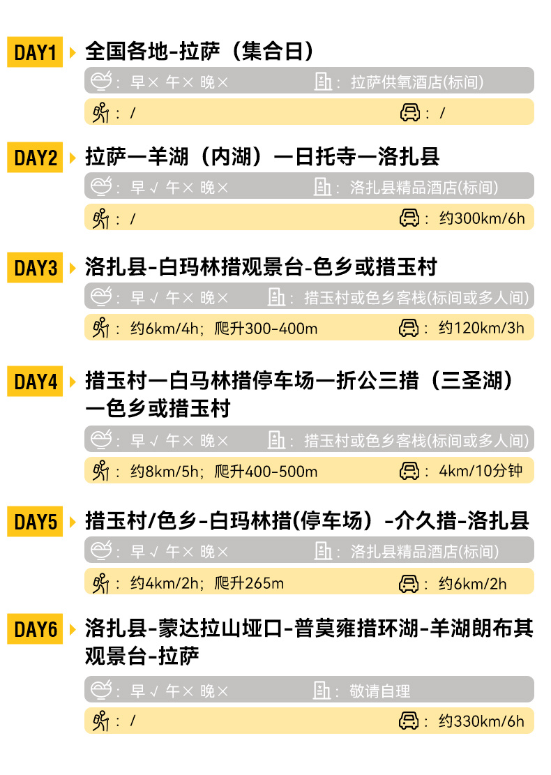 ①拉萨精品酒店1晚②洛扎县精品酒店2晚③两晚色乡/措玉村当地标间或多人间民宿。
