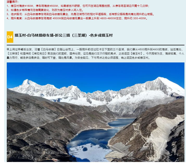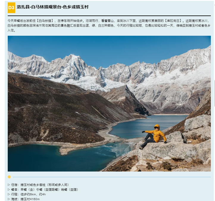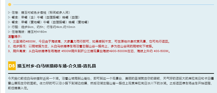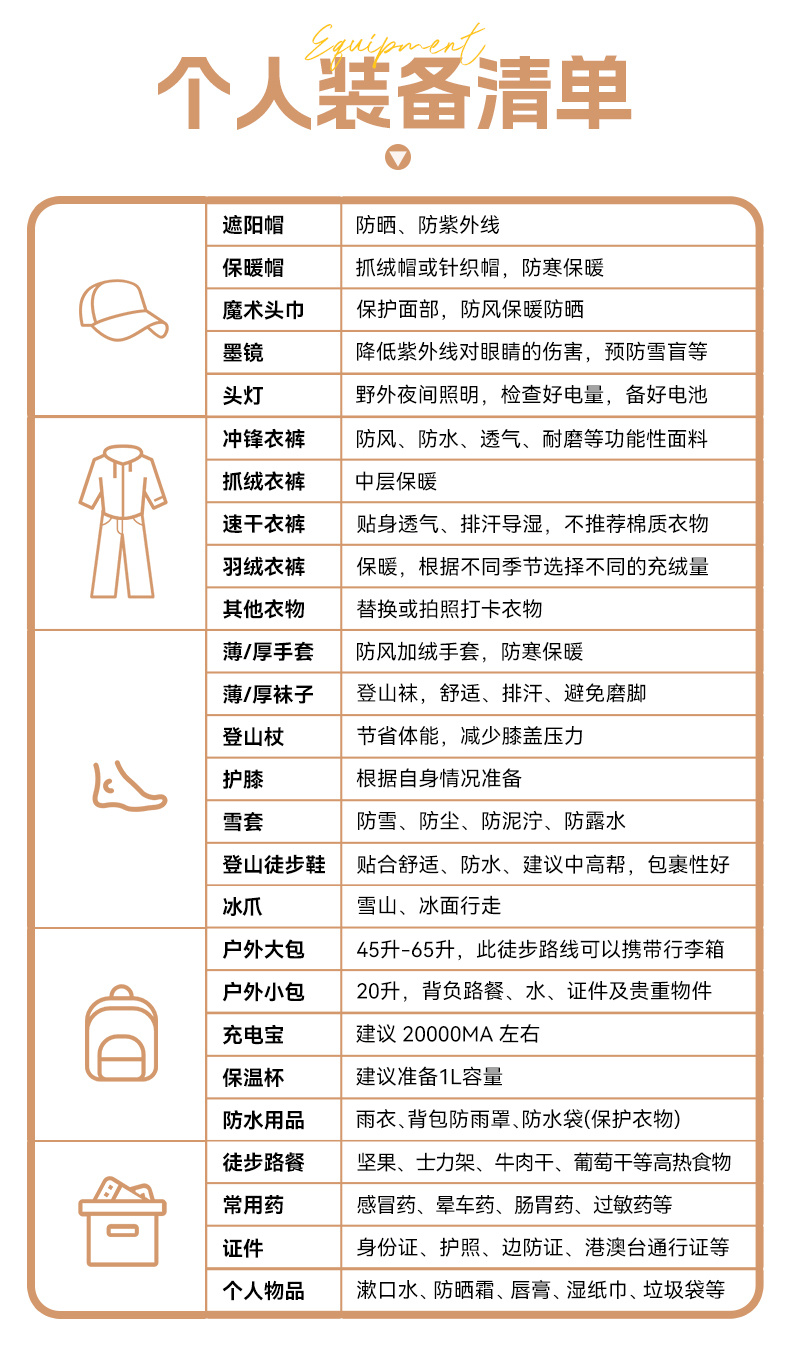 3、餐食:全程不含午餐、晚餐,提前准备3-4天徒步中午的路餐,建议准备易携带、热量较高的食物:巧克力、士力架、面包、坚果、牛肉干、水果等。