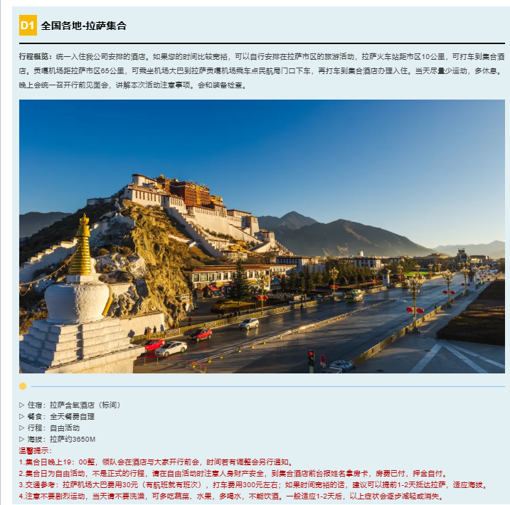 4、用餐:含拉萨酒店1次早餐、其余地区根据酒店冬季情况确定是否早餐包含,其余旅途中的餐和晚餐自理。