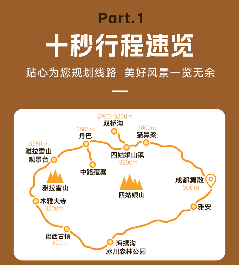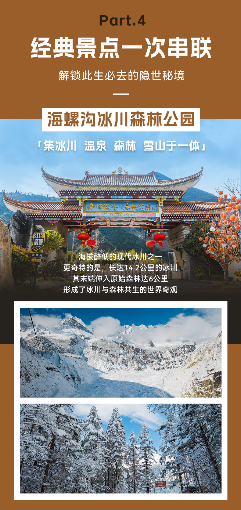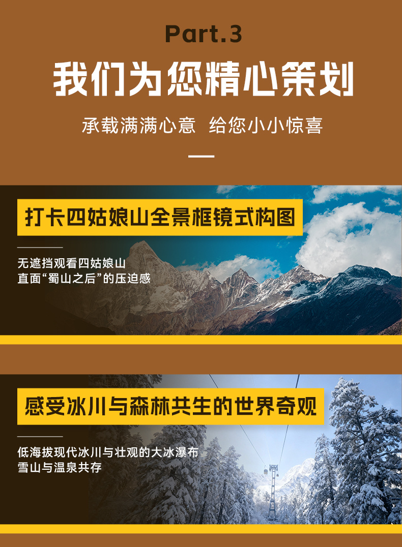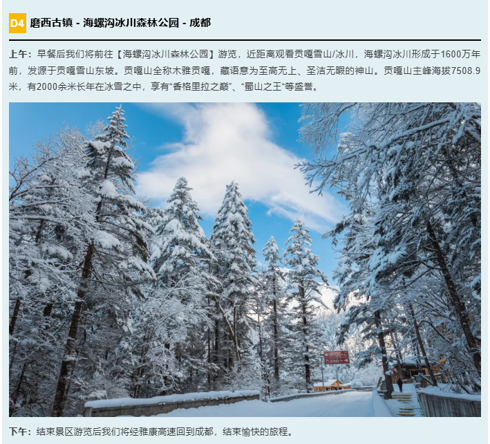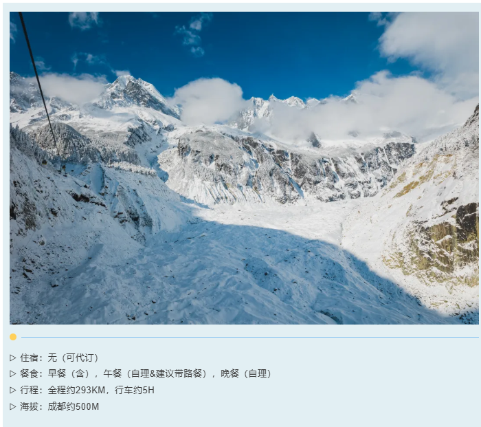 3、其他:不含海螺沟索道,价格参考为135元/人(天气好可自行购买索道票,坐索道到四号营地近距离观赏贡嘎雪山和冰川)