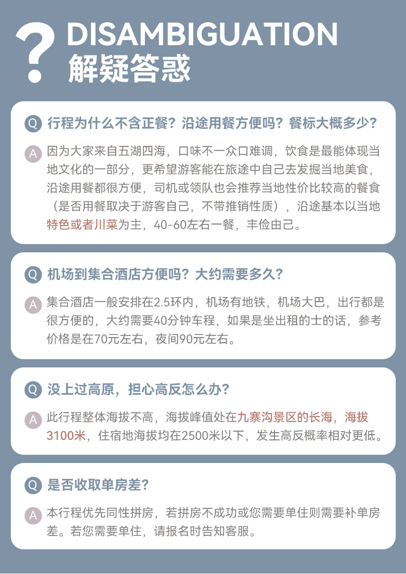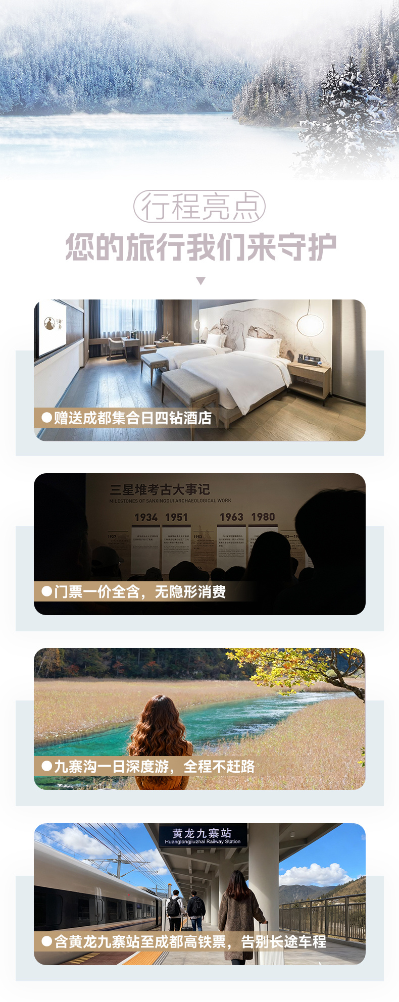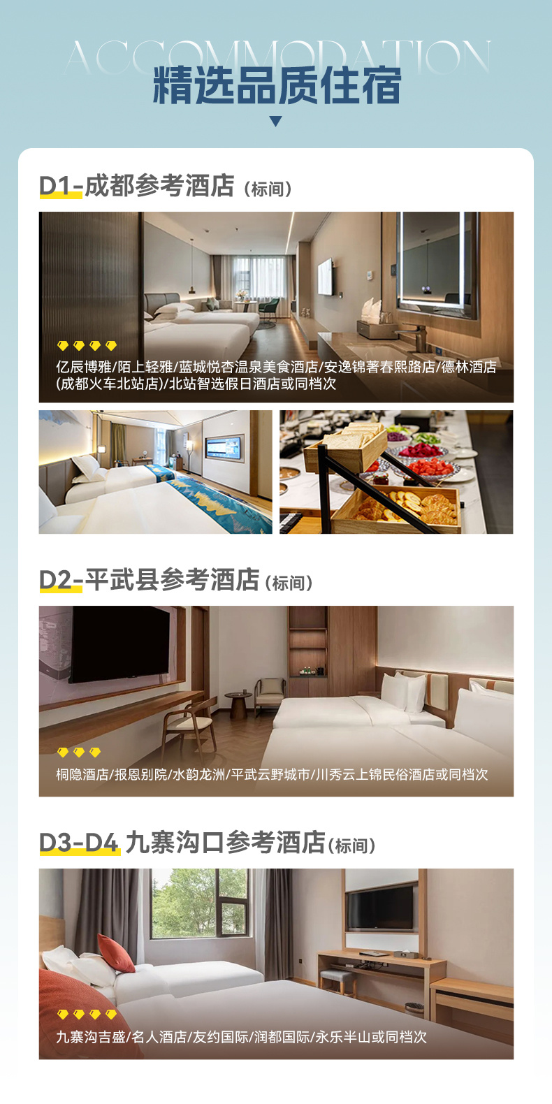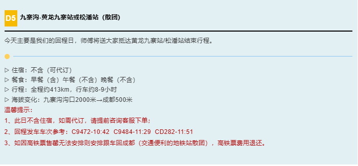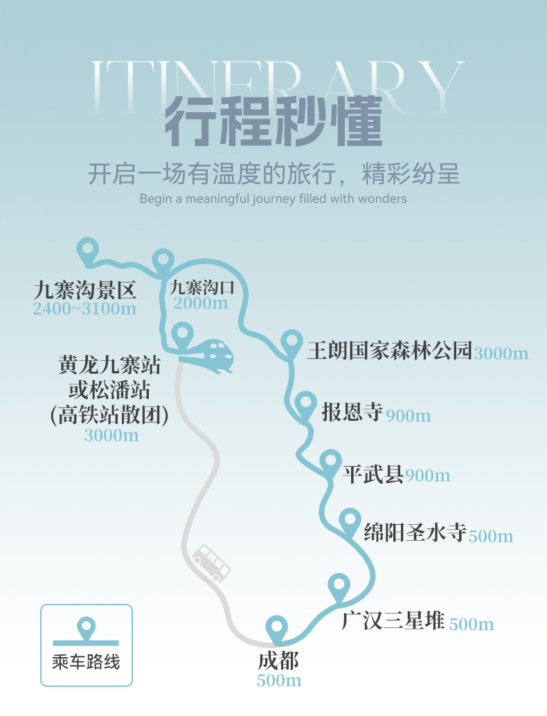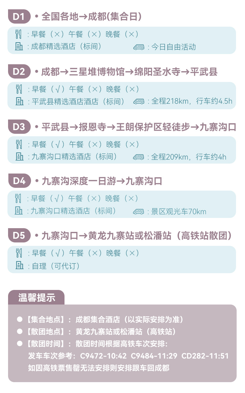 1、交通:全程包车往返,根据人数安排合适车型、黄龙九寨站至成都单程高铁票二等座。行程用车参考: