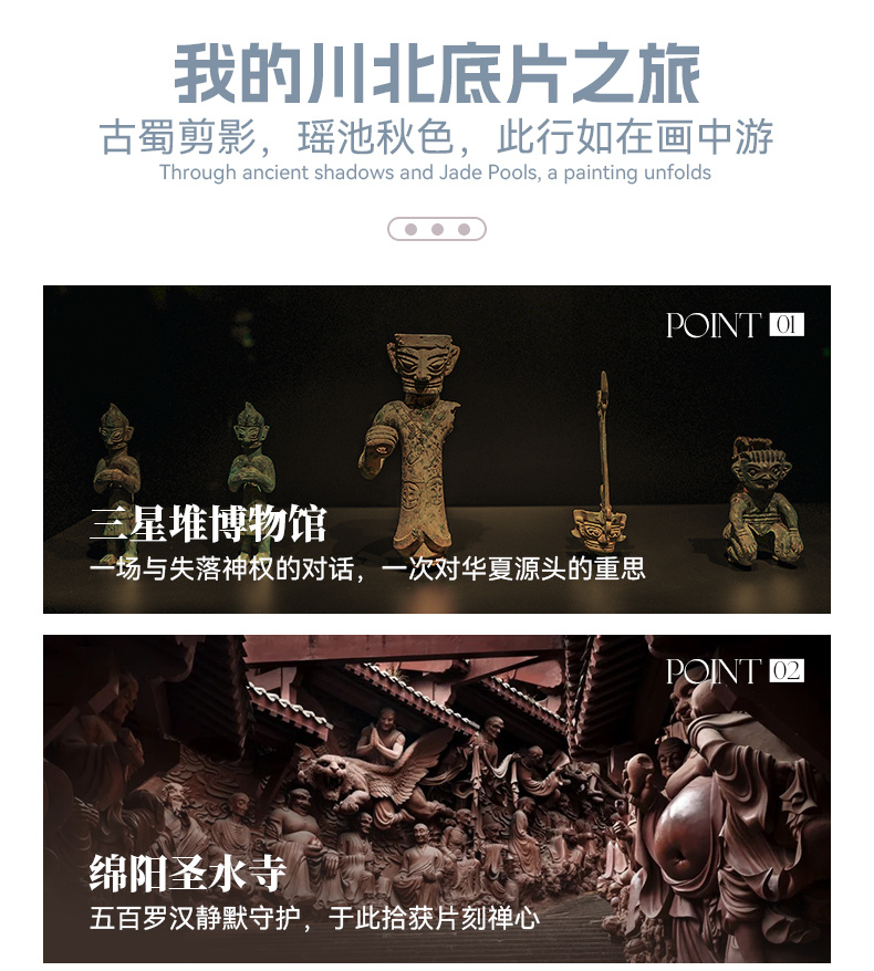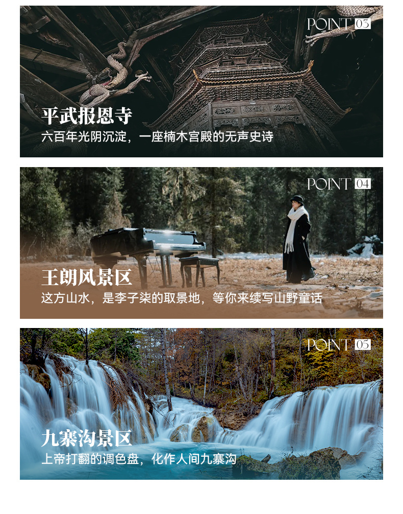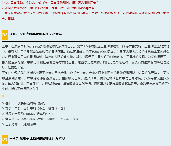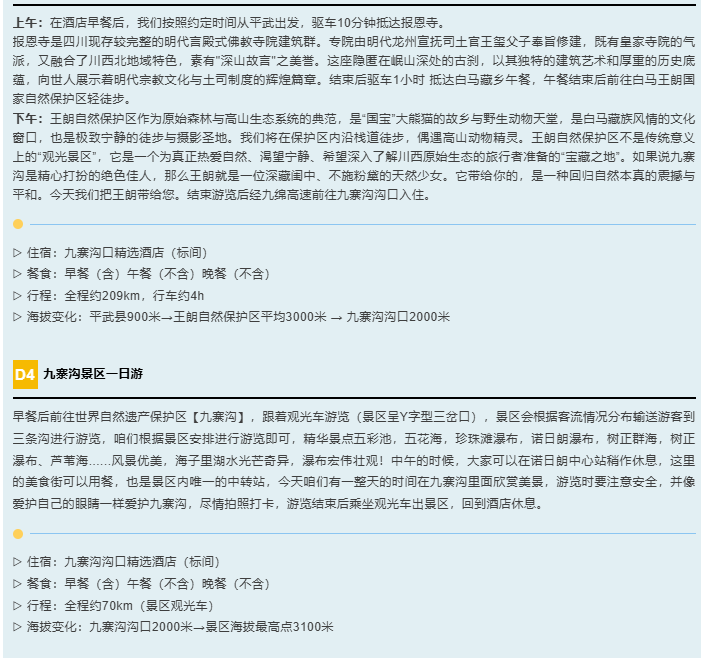 3、门票:三星堆门票72元/人、报恩寺门票40元/人、王朗保护区138元/人(门票+观光车套票)、九寨沟门票190元/人+观光车90元/人。