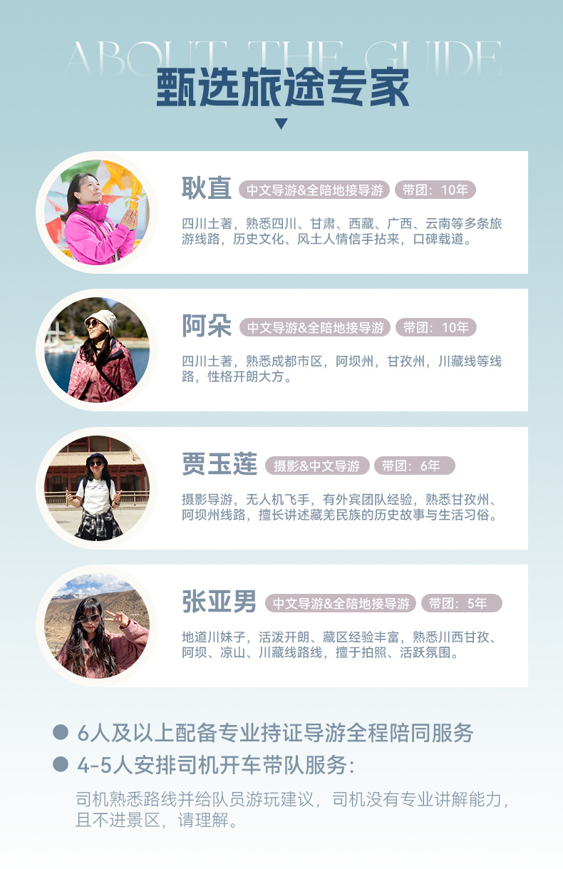 4-5人安排司机开车带队服务,司机熟悉路线并给队员游玩建议,司机没有专业讲解能力,且不进景区,请理解。