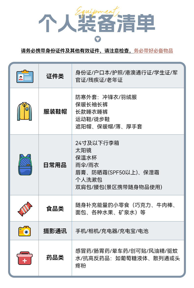 如持有老年证、军官证、士兵证、伤残证、学生证、国家级记者证等特殊证件,请在报名时告知报名客服且携原件出行,根据当地政策减免相关费用,如有优惠,现场退还相应差价;若因队员没有提前告知,旅行社则按正常票价购买门票,则无法退还相应差价,请悉知!