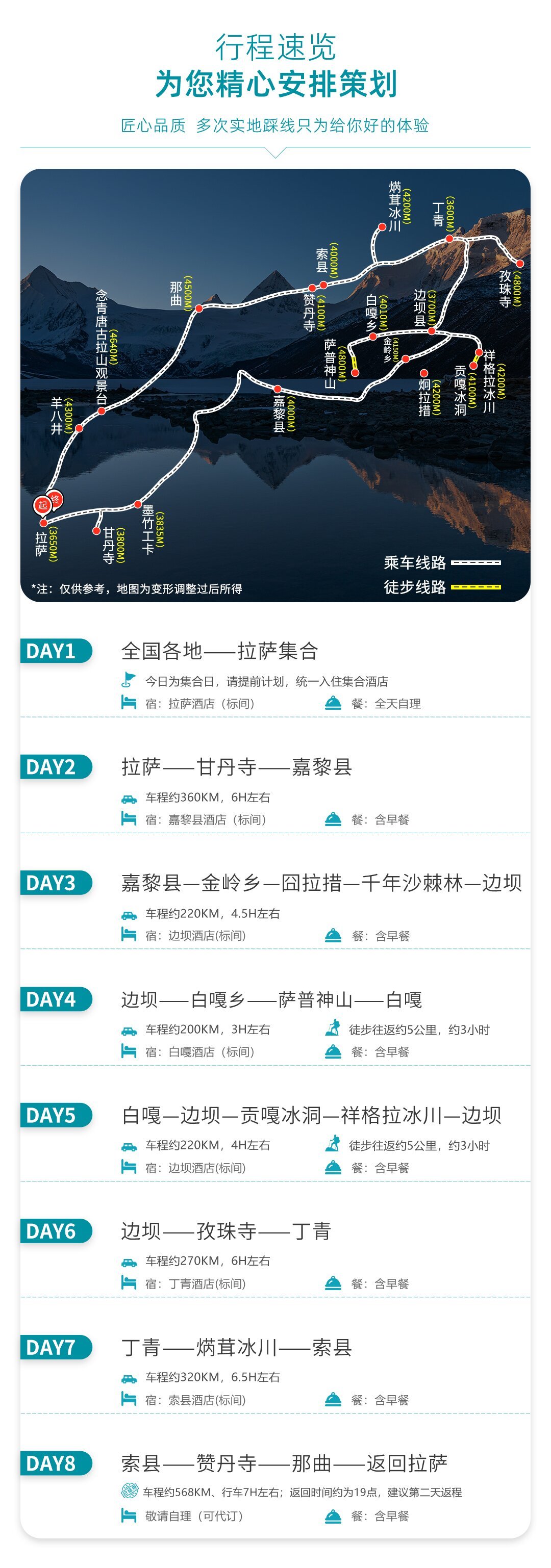 (2)全程徒步约10公里,平均海拔为4400米左右,徒步最高海拔为萨普冰川4900米,住宿最高海拔为白嘎乡4010米左右。