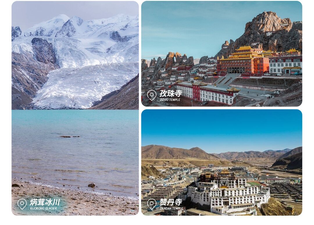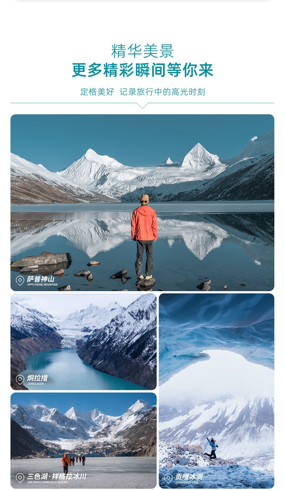 3、全程打卡炯拉措、萨普神山、贡嘎冰洞、祥格拉冰川、孜珠寺、焫茸冰川等著名景点。