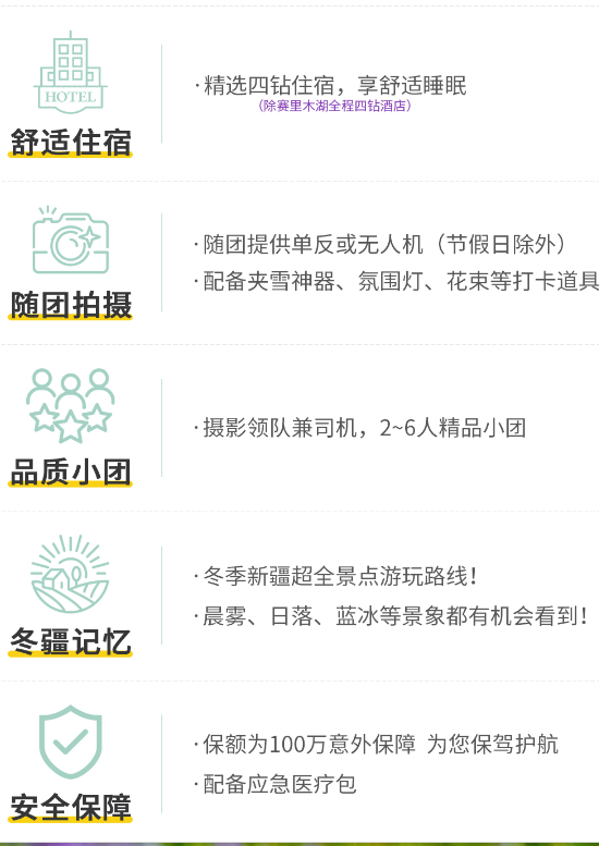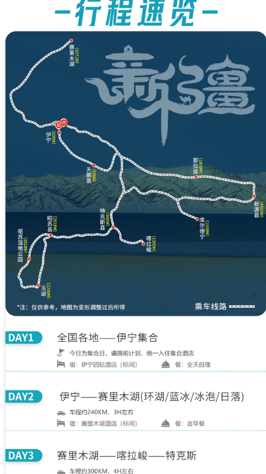 【报名条件】 报名本活动的队员,年龄在8-65周岁,身体健康,无心脑血管等疾病(60岁以上需提供体检报告,16周岁以下需监护人陪同) 【个人装备提示】 冬季行程温度在零下25到零下10度之间,请按照此温度准备好衣物;厚羽绒服、保暖打底衣物、户外鞋(雪地靴)、围巾、有防水功能尤佳、雨具(天气多变)、遮阳帽+保暖帽、保暖手套、保暖长袜、墨镜、防晒霜、润唇膏、个人洗漱用品、24寸以内拉杆箱+小背包、保温杯、摄影拍照器材、暖宝宝、感冒药、肠胃药、晕车药等常用药品、身份证件等 【重要提醒事项】 1、关于行程: (1)此活动最低成行人数为2人,上限6人一车。 (2)行程第一天为伊宁集合日,当日抵达伊宁酒店集合即可。 (3)新疆的冬天比较寒冷,请提前做好御寒准备。 (4)新疆与内地有两小时左右的时差,天黑时间较晚,我们应做好适应时差的准备; (5)我们此行的目的地是新疆,多为少数民族,请务必尊重他们的民族习惯,尽量做到互敬互让,避免发生冲突。 2、关于气候: 冬季气温较低,行程温度在零下25到零下10度之间,请按照此温度准备好衣物。 3、关于用餐: 全程含早餐。午餐和晚餐可沿途AA,部分地区条件有限,不会有太多的选择,大家可适当带些可口的干粮,以备不时之需,另新疆本地食物以牛羊肉为主。 4、关于住宿: (1)沿路住宿均为当地酒店或客栈标间,除赛里木湖外均为4钻酒店。 (2)部分地方抵触偏远,酒店设施不全,一次性拖鞋、酒店用品、吹风机配备有限,建议自备洗漱用品。 5、关于全程可能出现的不适反应: (1)饮食文化差异性较强,可能出现肠胃不适或上火的情况,可以自行携带一些调节肠胃的药品和清火药品,清淡饮食,避免暴饮暴食。 (2)新疆昼夜温差较大,请根据当地温度酌情添加衣物,随身携带保暖衣服。 (3)新疆紫外线很强,最好戴上墨镜、防晒霜、头巾以免紫外线灼伤皮肤。 6、关于环保: 我们本次活动大部分地方均为原生态地区,爱护环境是我们每个人的责任。每天在行程中产生的垃圾记得带走,统一丢到垃圾箱或带回酒店处理。 7、关于报名: (1)凡有传染性疾病、心血管疾病、脑血管疾病、呼吸系统疾病、精神病、严重贫血病、大中型手术的恢复期病患者、行动不便者、孕妇等,以及其他不适合出行者,请不要报名。代他人报名者也请核实代报人的身体状况。如果报名者或者代他人报名者隐瞒身体状况,造成的后果,由自己承担; (2)报名需提前询位确定,支付活动费,报名成功以支付活动费用为准。支付活动费用后请告知客服人员查询,并确认报名信息。 8、关于照片使用权: 旅行社作为活动发起方,拥有旅行活动期间所有照片、视频等素材使用权。 【退款说明】 1、活动集合前6日00:00之前退出,活动费用可全额退返,或延期到下一次活动使用; 2、活动集合前6至4日00:00之前退出,需扣除20%活动费用,余款予以退还; 3、活动集合前3至1日00:00之前退出,需扣除40%活动费用,余款予以退还; 4、活动集合当日00:00之后退出,需扣除60%活动费用,余款予以退还; 5、活动开始后,因个人原因退团,只退还未产生的门票以及餐费。