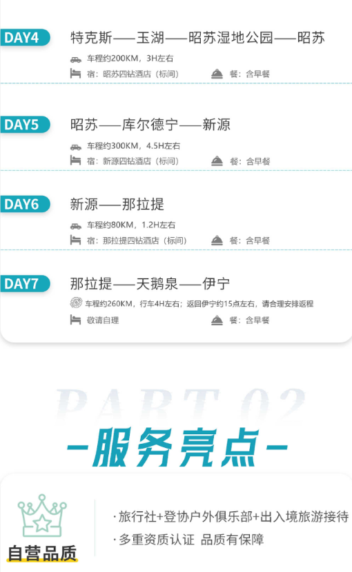 4、门票:赛里木湖自驾票、喀拉峻自驾票、库尔德宁自驾票、玉湖自驾票、昭苏湿地自驾票、天鹅泉自驾票、那拉提自驾票;