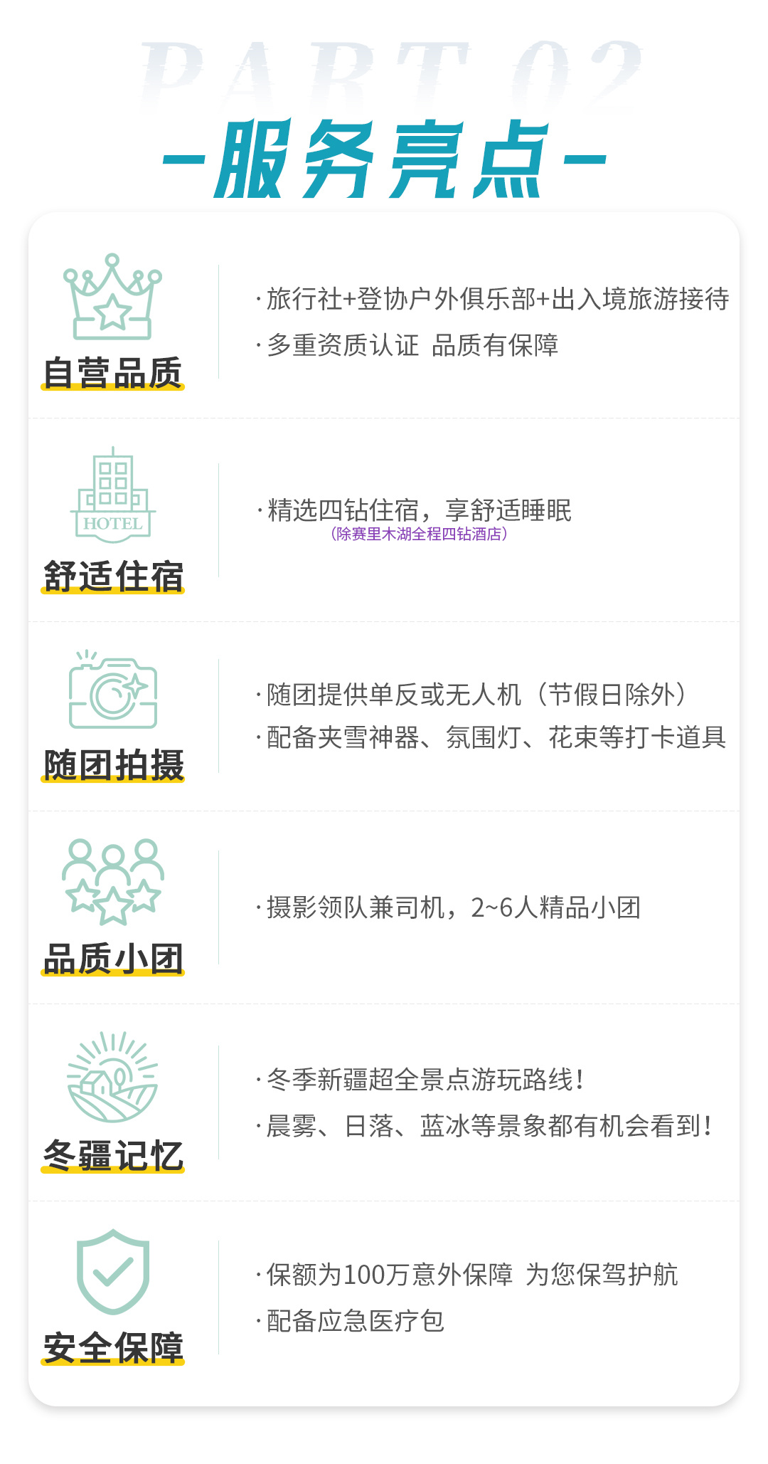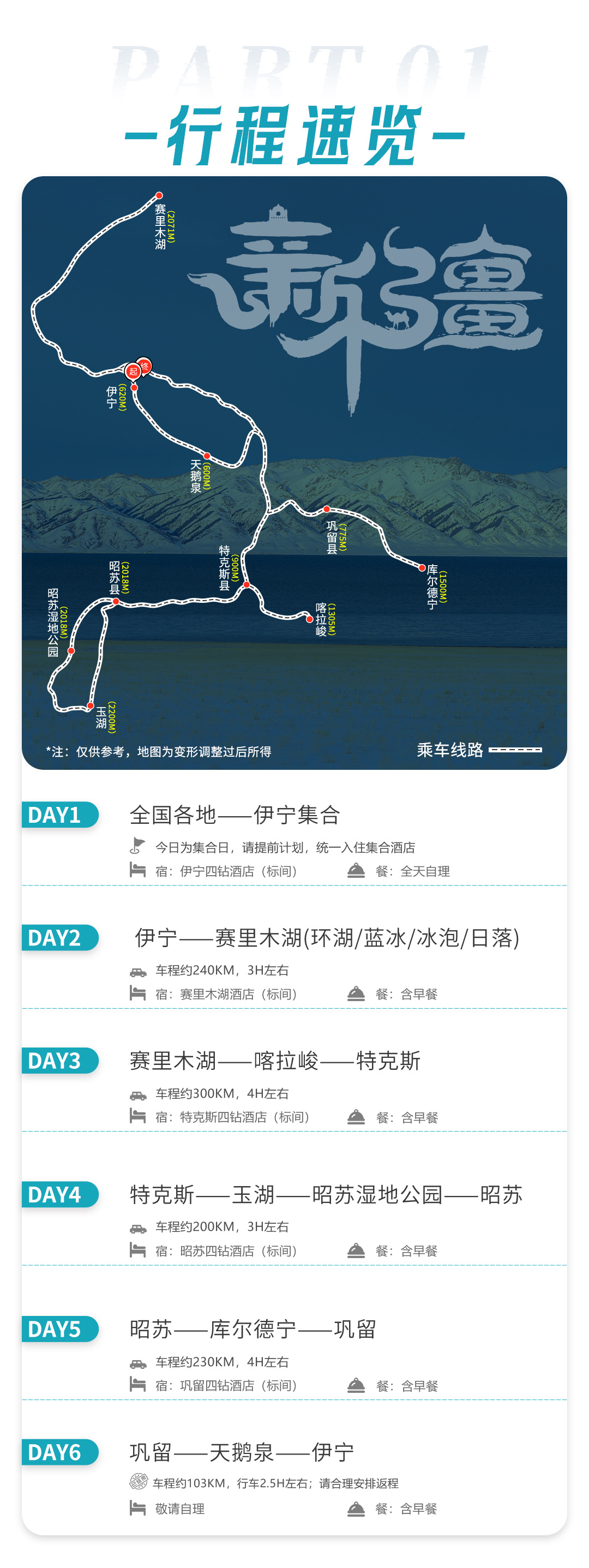 (1)沿路住宿均为当地酒店或客栈标间,除赛里木湖外均为4钻酒店。