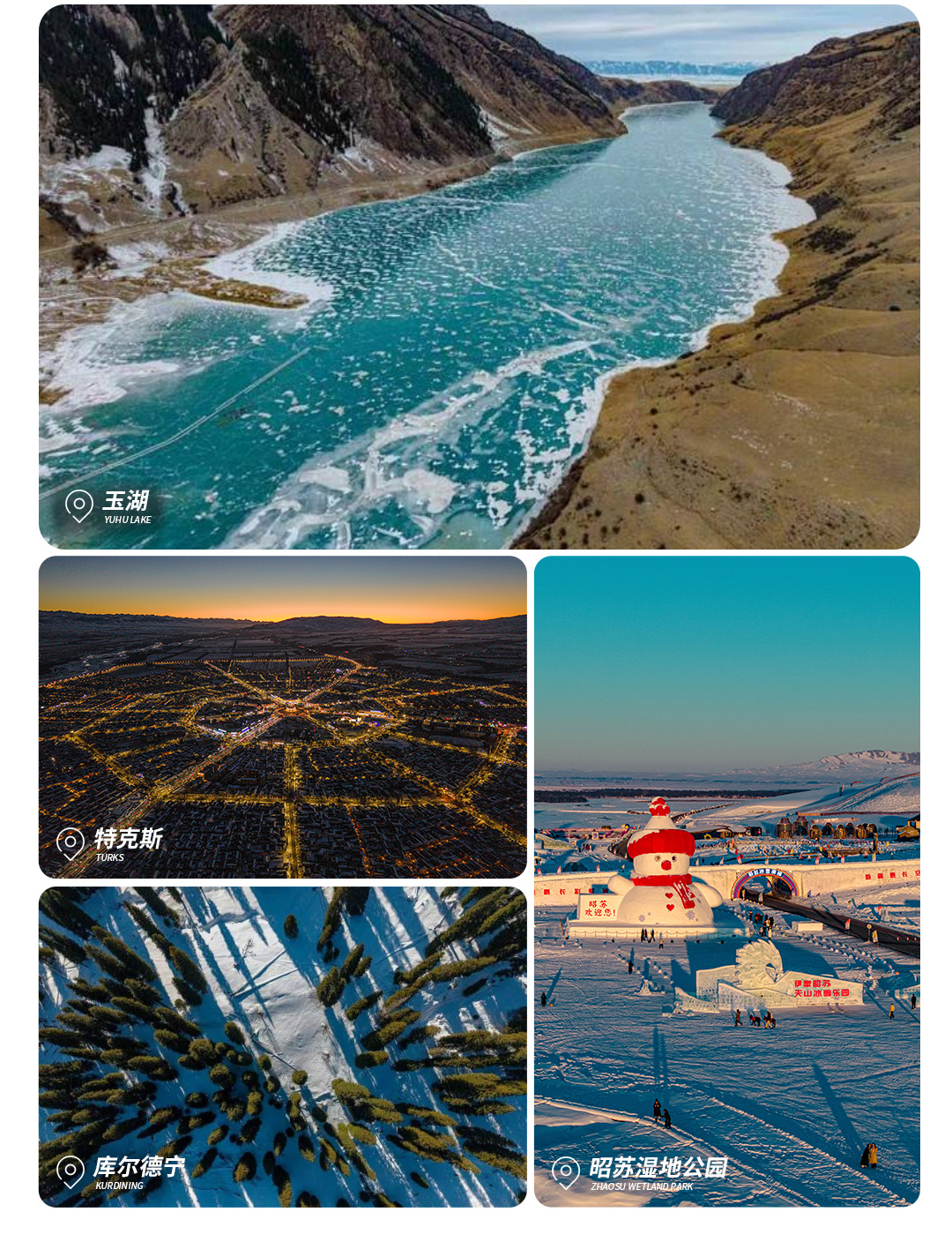 1、冬季伊犁超全景点游玩路线!雪山、蓝冰、雾凇、天鹅、日出日落等景象都有机会看到,尽览冬日风光!