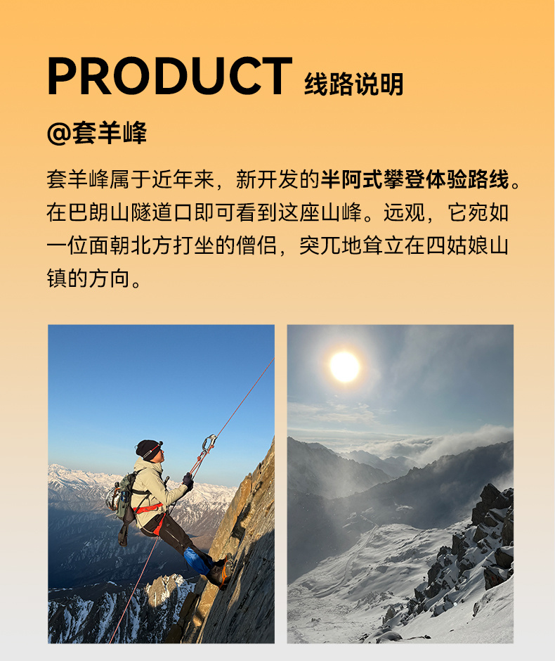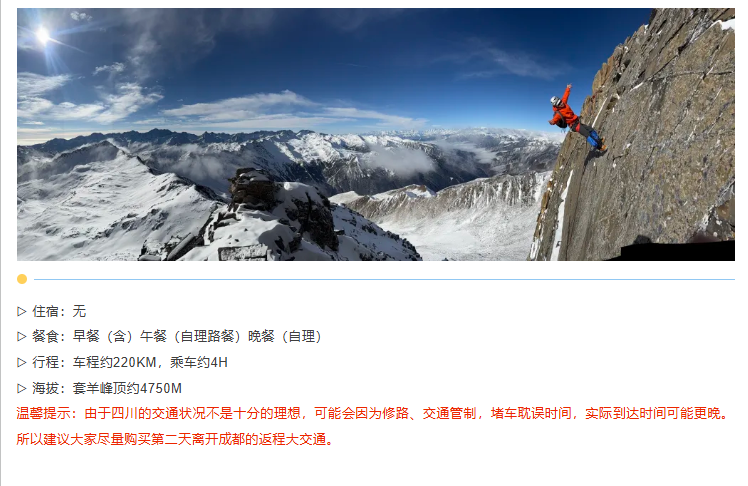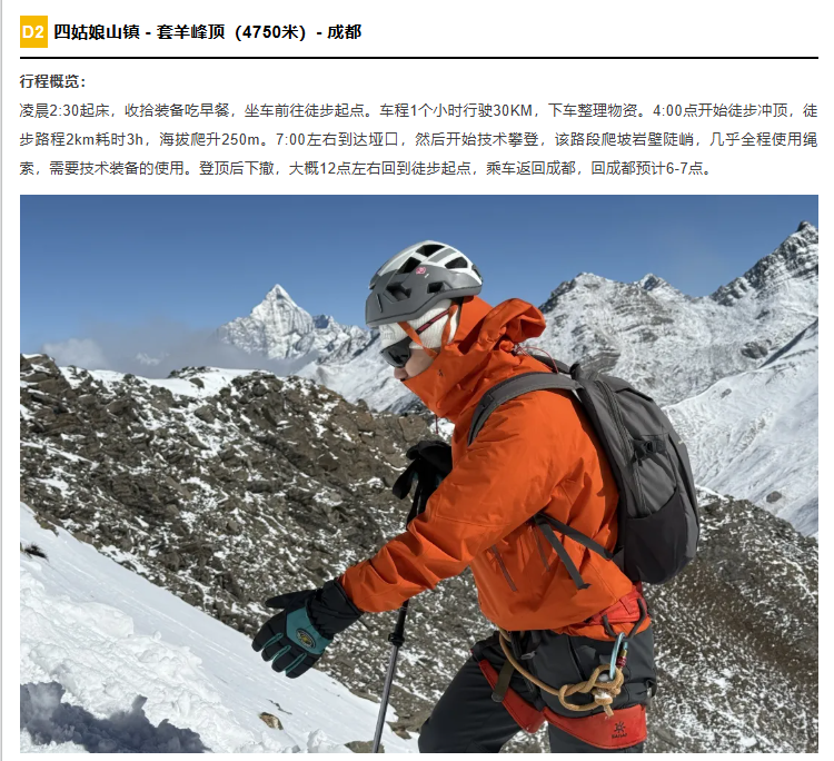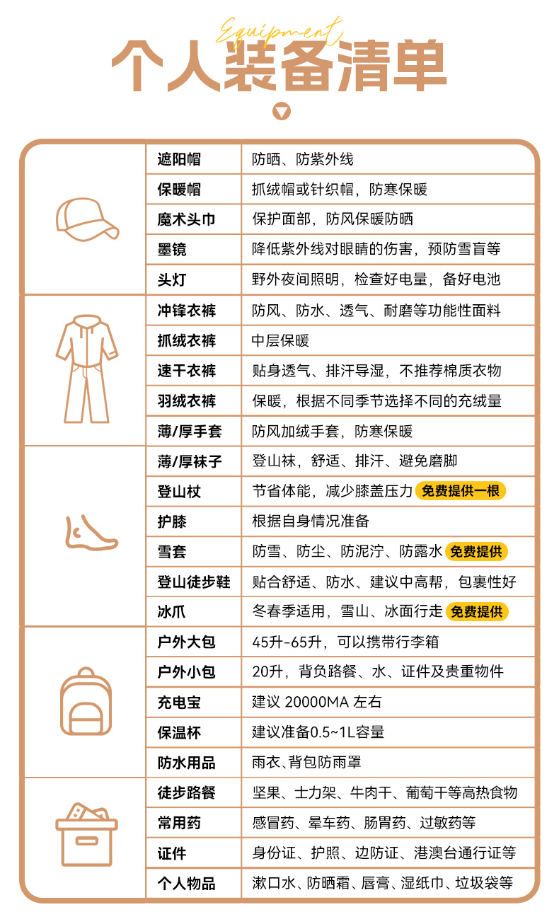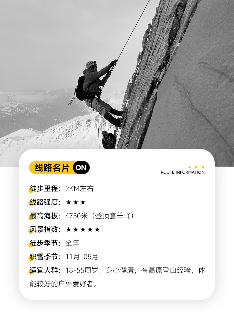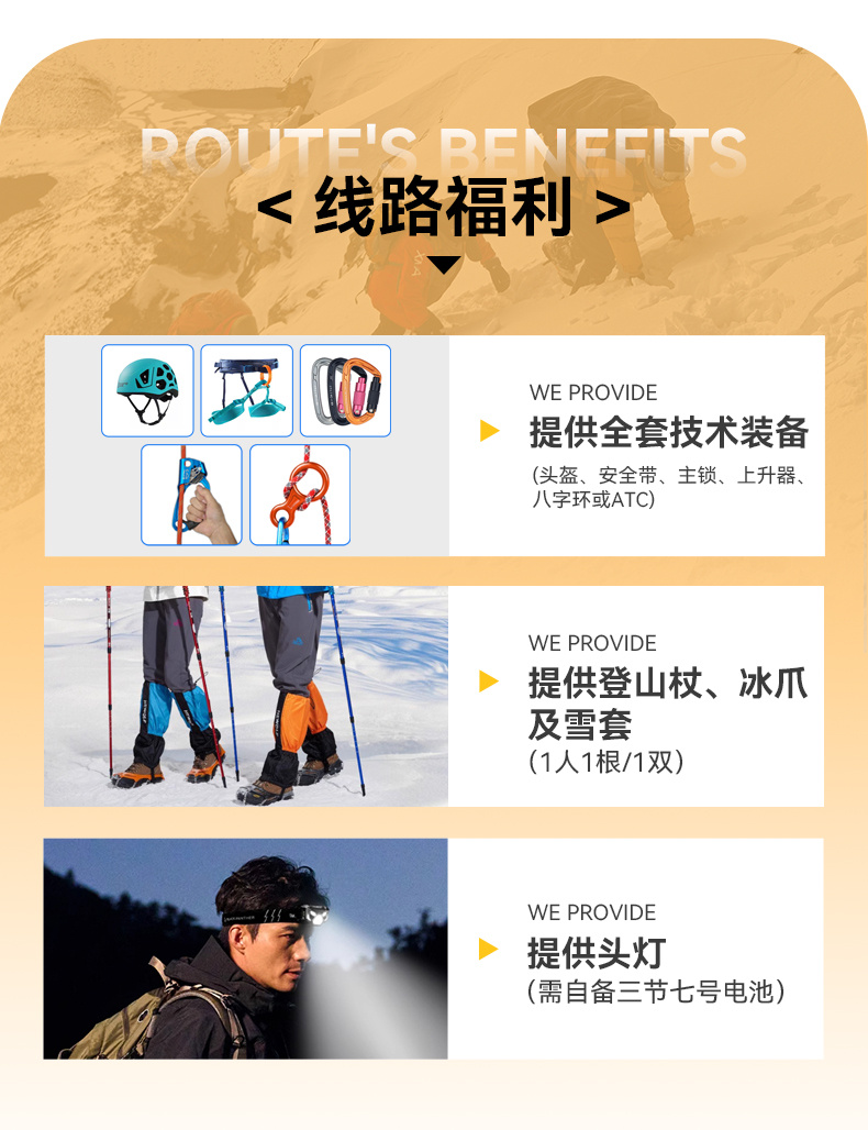 6.装备:个人全套登山技术装备(头盔、安全带、主锁、上升器、八字环或ATC)。