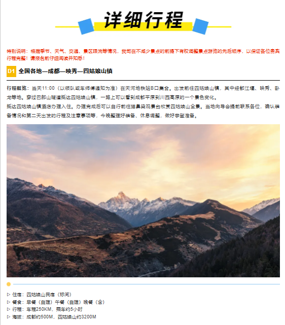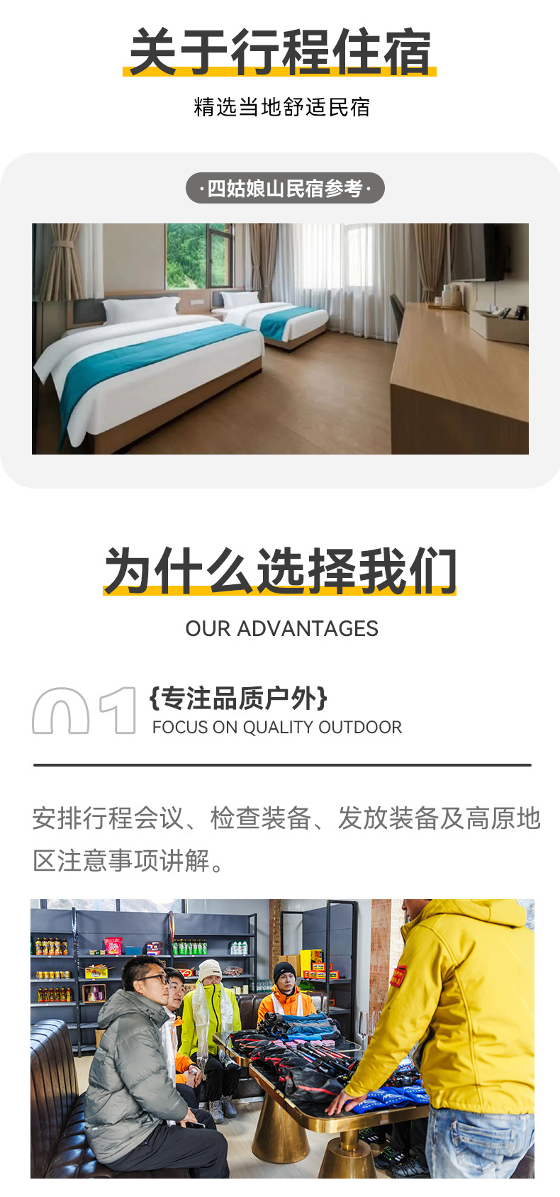 2.住宿:按行程所列标准入住。(其中:四姑娘山镇酒店住宿1晚)单独参加我们散客拼团活动,默认与其他同性拼房,如果无法拼房也无须另补房差。