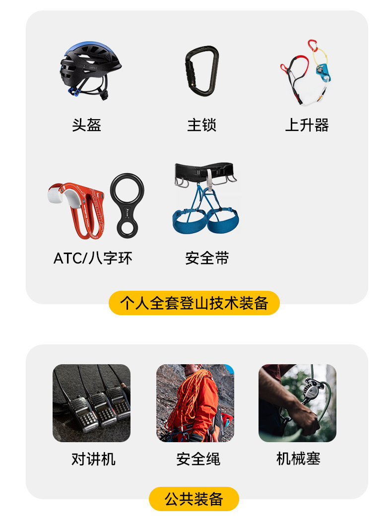 5.个人全套登山技术装备(头盔、安全带、主锁、上升器、ATC/八字环、冰爪)。