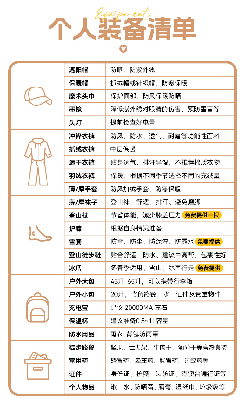 6.公共装备 :对讲机、绳子、冰锥、医药、急救氧气等。