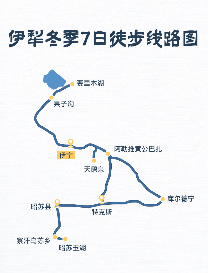 如遇气温原因,赛里木湖冰层没有冰冻结实,无法安全徒步穿越,改为徒步松树头登高往返3-4公里。