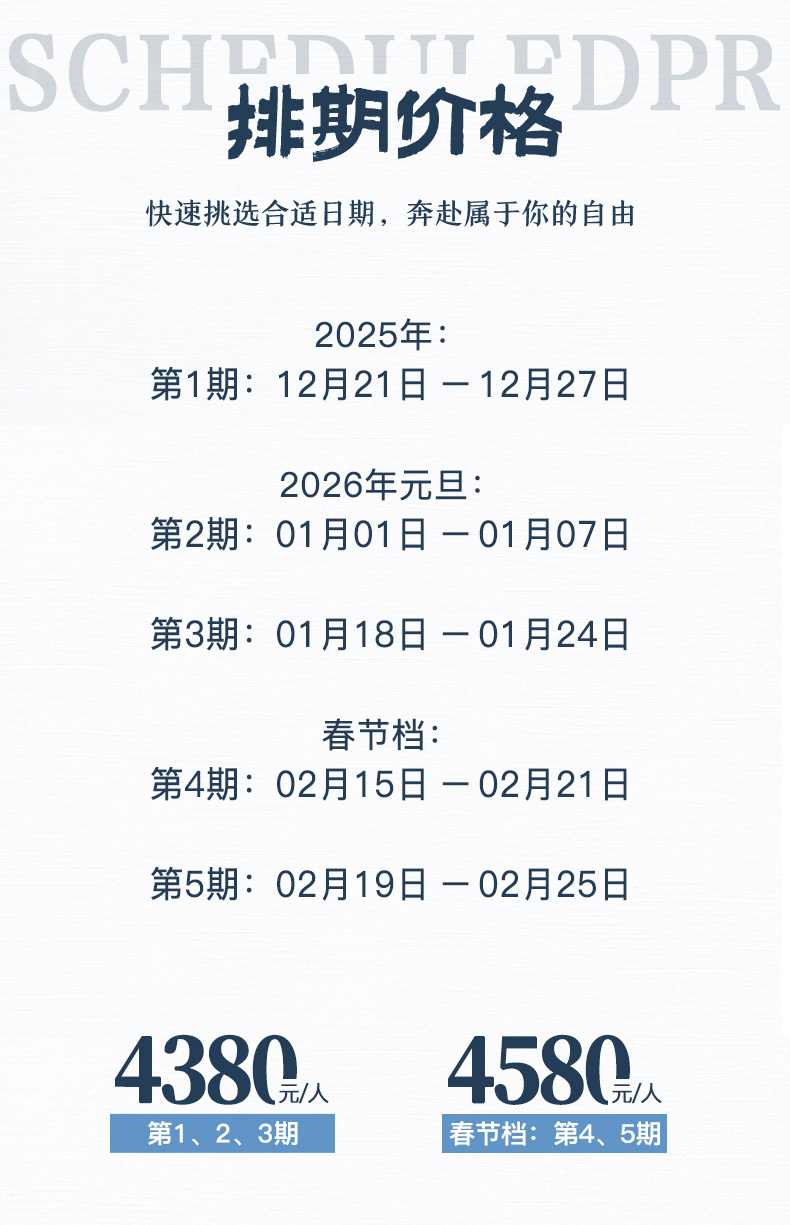 关于合同和余款的说明:缴纳订金后,确认报名!出发前3-4天会有客服和您联系,并建立微信活动群,通知相关事宜,余款在集合当日付清并签署旅行合同。