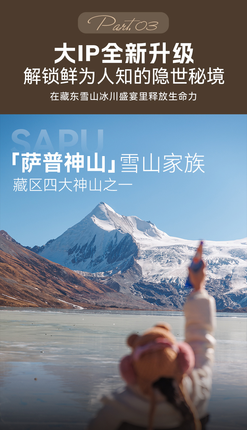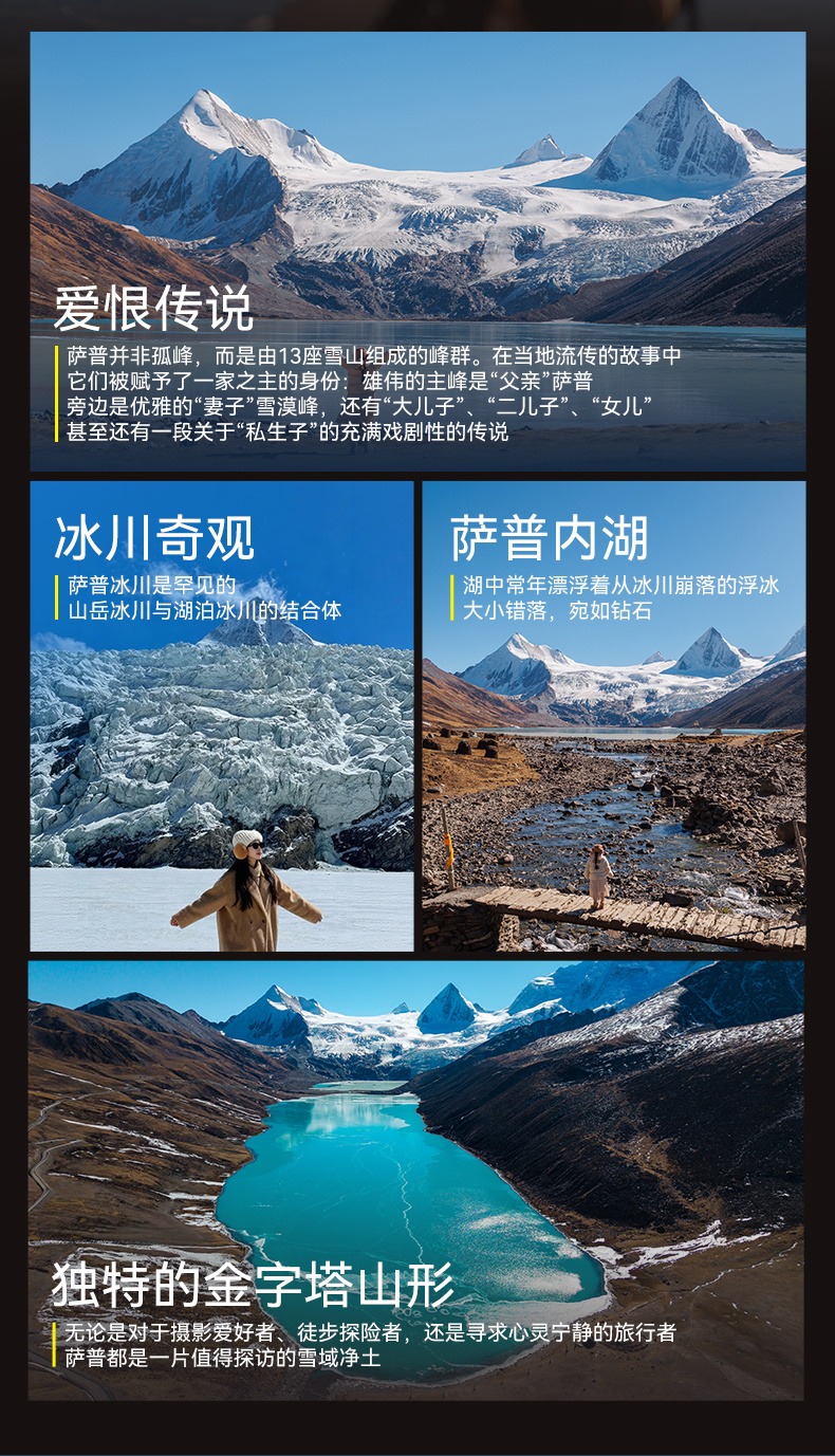从边坝县出发,穿越藏北荒原,终于见到萨普神山真容!到达景区大门后,换乘环保车进入萨普外湖。沿着萨普外湖徒步4公里,到达内湖。金字塔状的主峰倒映在内湖碧水中,牦牛在冰川未端悠闲吃草。转湖时偶遇当地牧民,说看到神山全貌的人会幸运一整年。