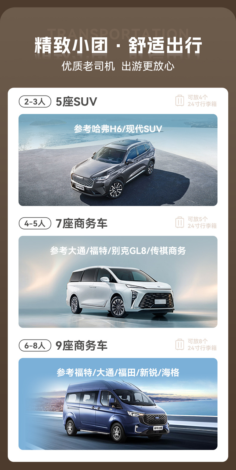 1、交通:全程车费(5座/7座/9座车)、路桥费、油费等。