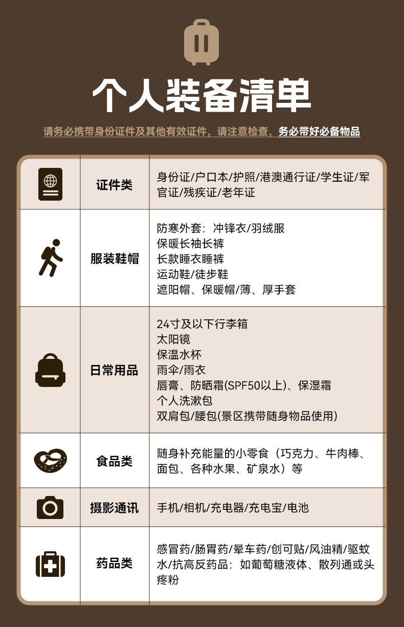 如持有老年证、军官证、士兵证、伤残证、学生证、国家级记者证等特殊证件,请在报名时告知报名客服且携原件出行,根据当地政策减免相关费用,如有优惠,现场退还相应差价;若因队员没有提前告知,旅行社则按正常票价购买门票,则无法退还相应差价,请悉知!