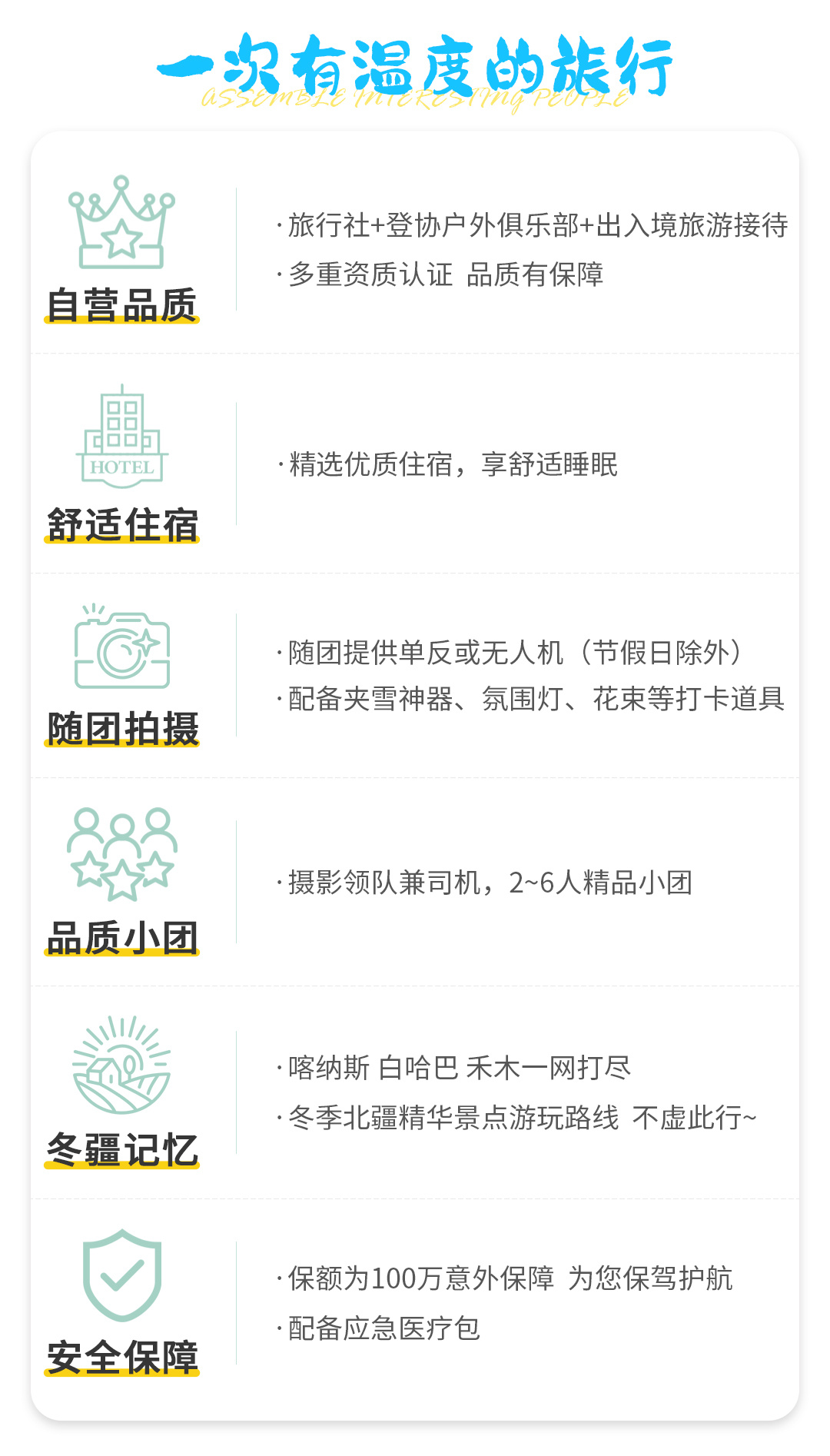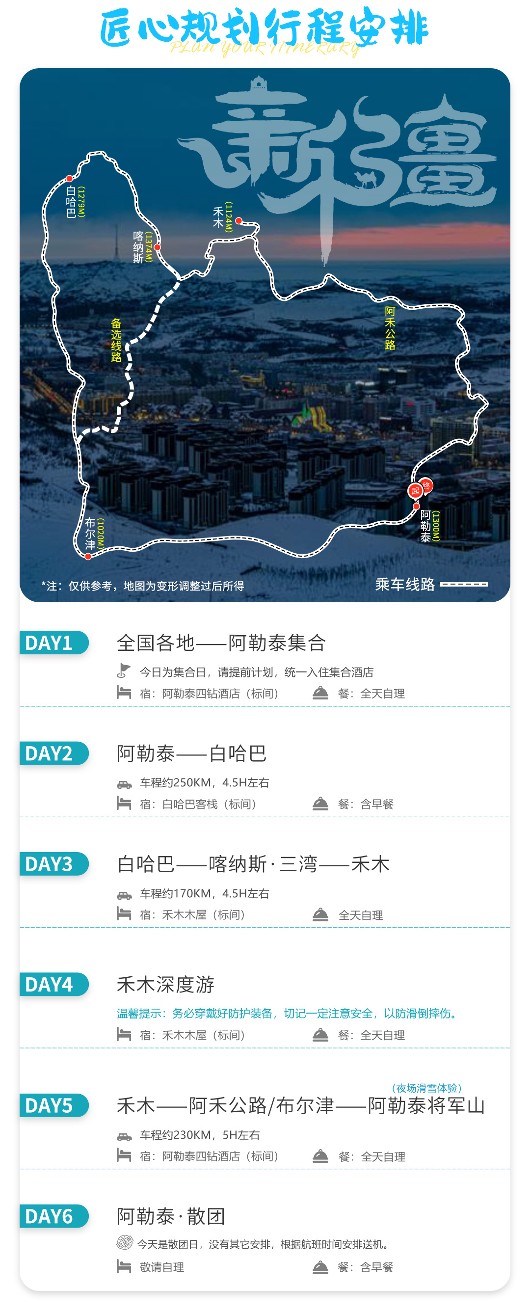 1、冬季阿勒泰地区天气多变,喀纳斯、禾木、白哈巴等地区容易受到雨雪天气影响,可能会封路。如遇突发情况,我们会在合理的范围内灵活调整游玩的先后顺序,但无法保证行程的完整性,未产生的费用也会在行程结束后退回,请保持合理的预期和准备。