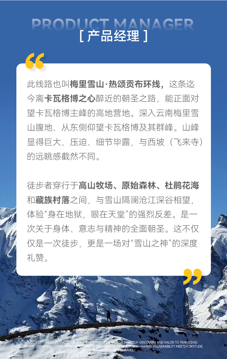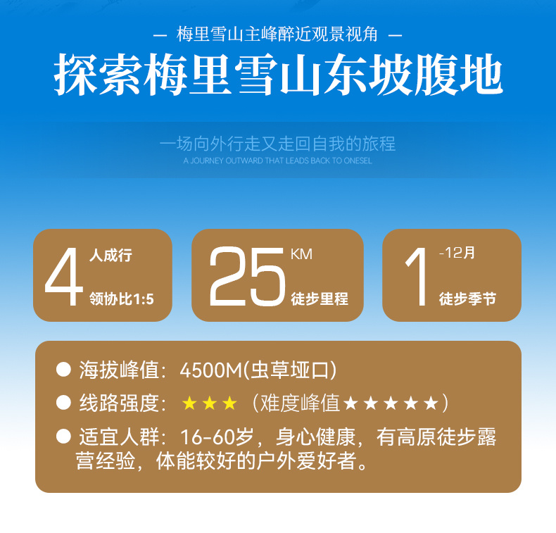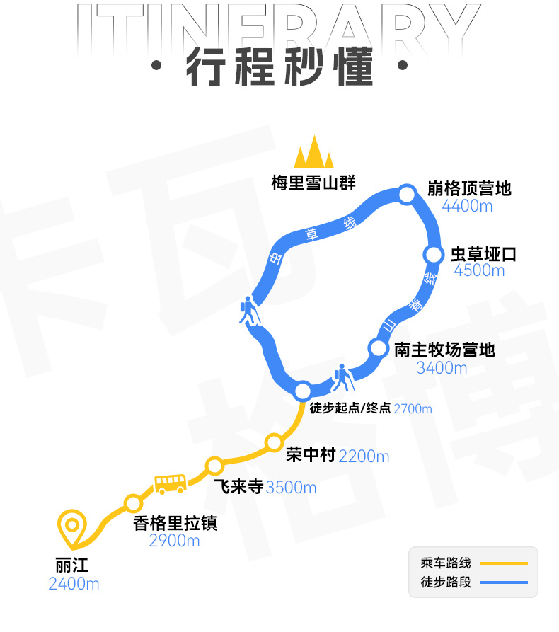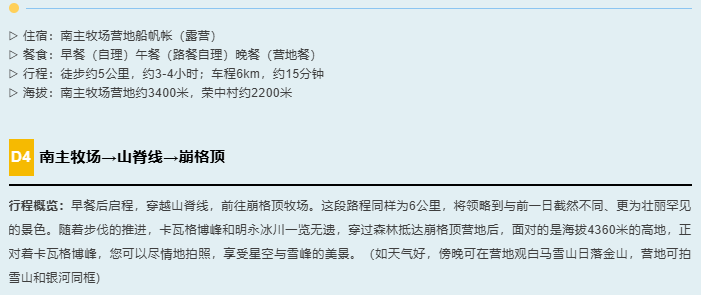 6.驮运:包含徒步期间背夫费用(个人最大重量不超过25斤,电子产品等贵重物品不能放背包里,建议随身携带,否则损坏或丢失不予赔付)。