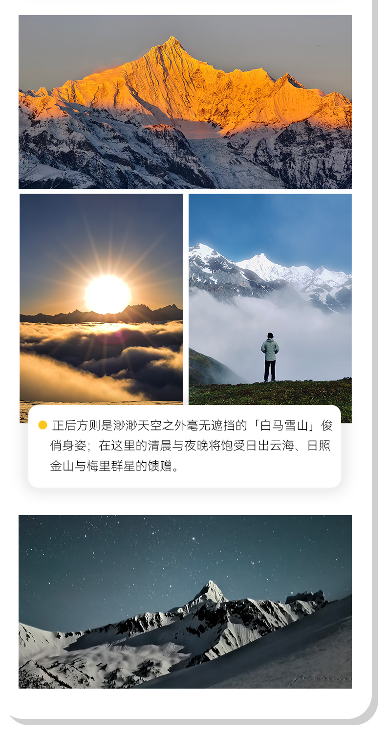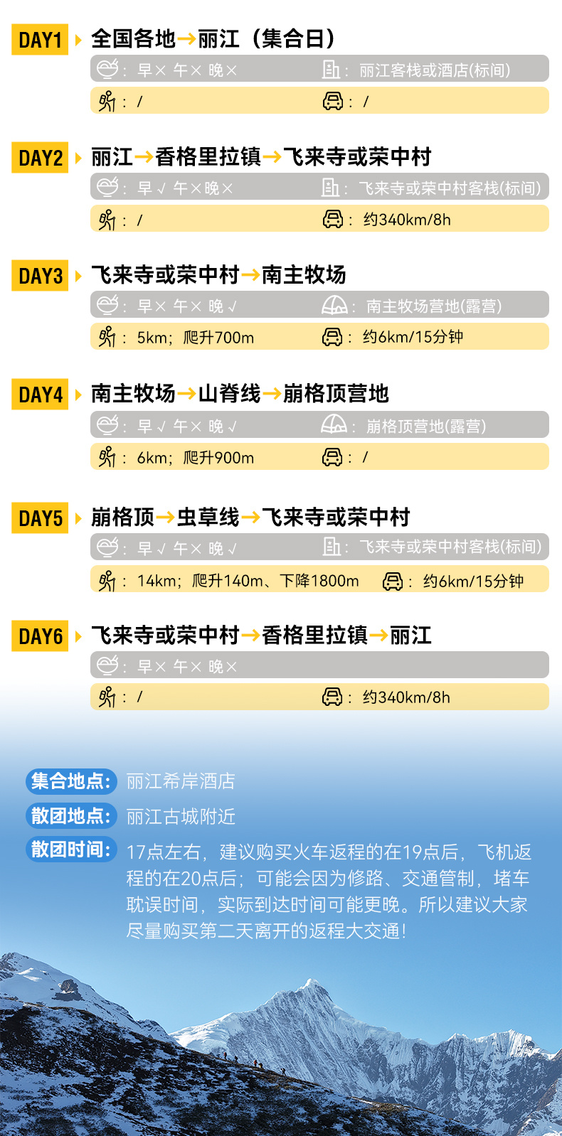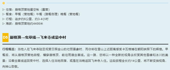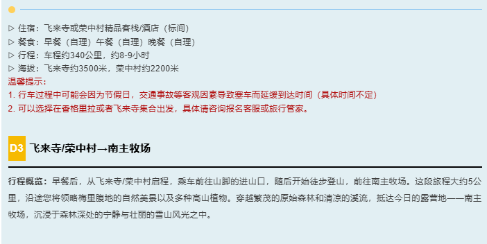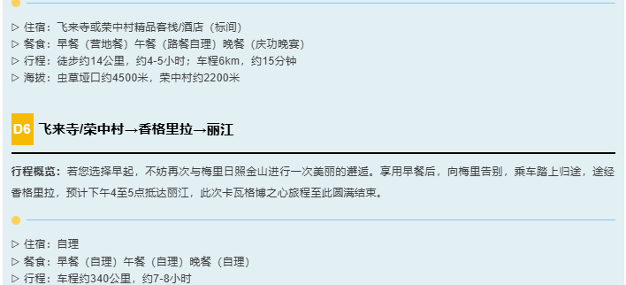 2.住宿:按行程所列标准入住(1晚丽江客栈或酒店;1晚飞来寺酒店,1晚荣中村民宿;2晚营地露营)。