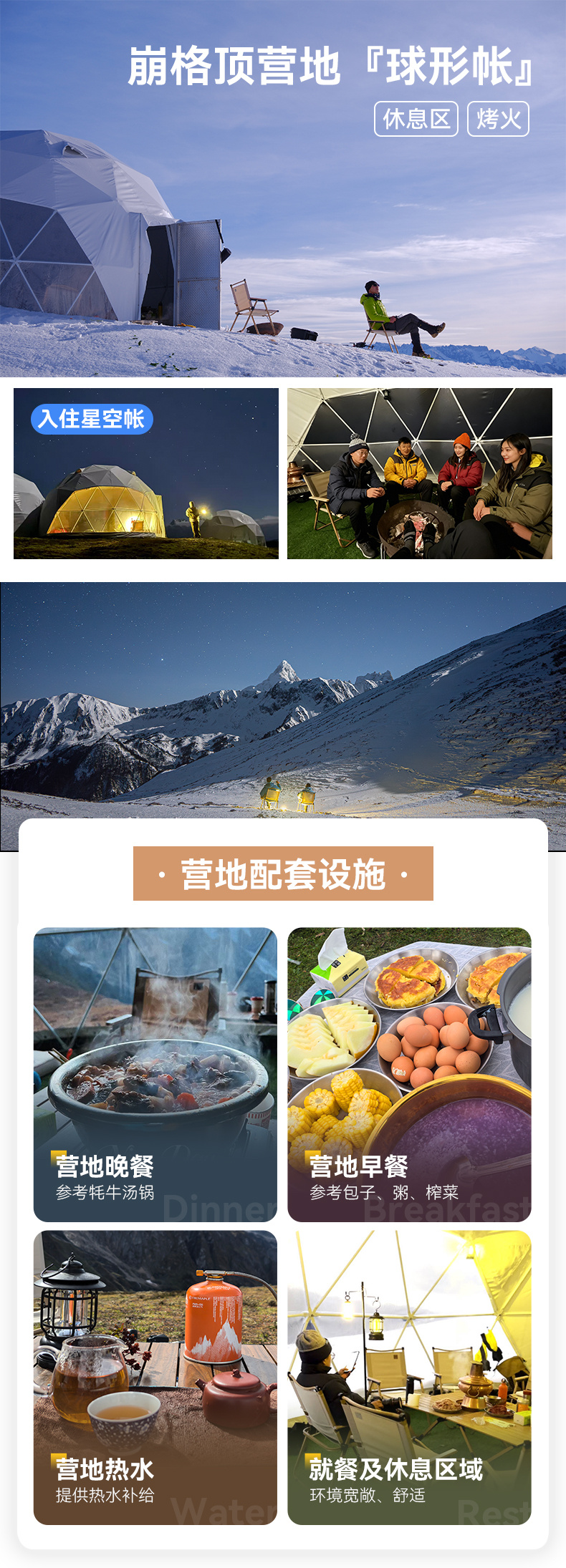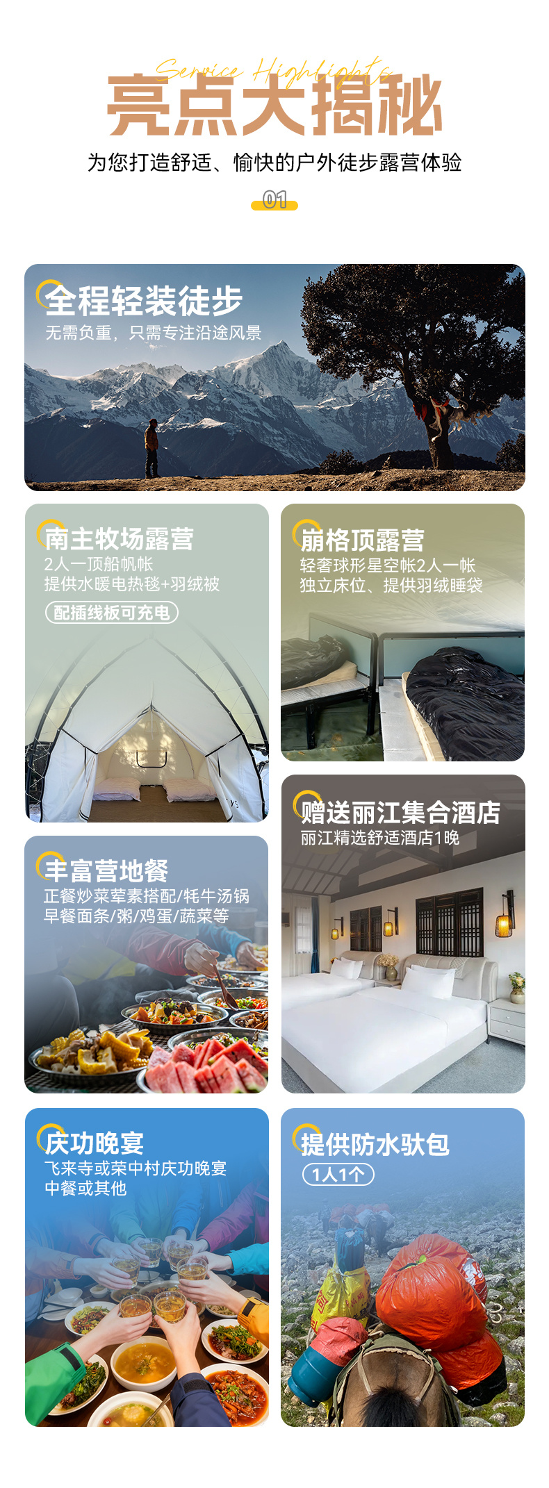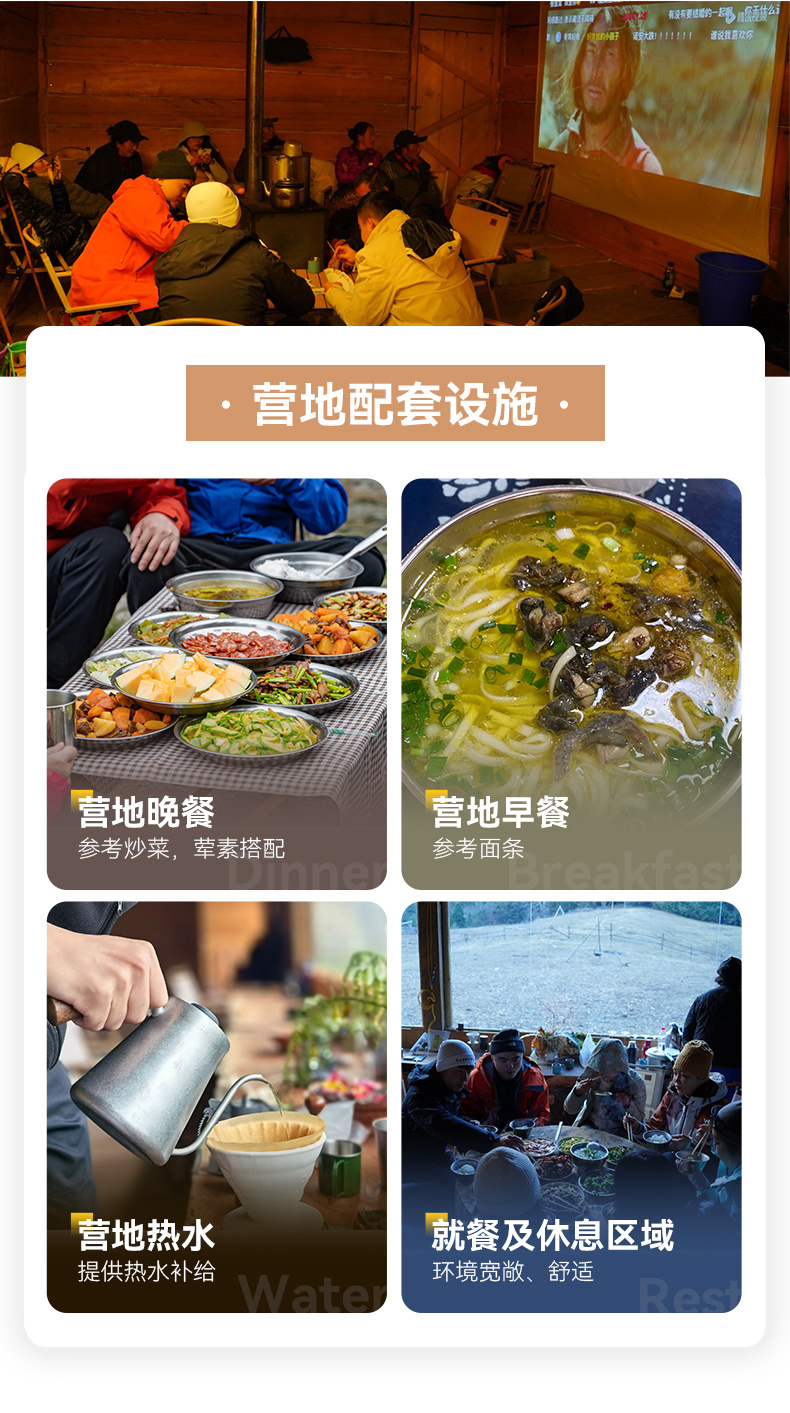 3.餐食:全程所列餐食含3正3早,包含庆功晚宴,营地早餐、晚餐。