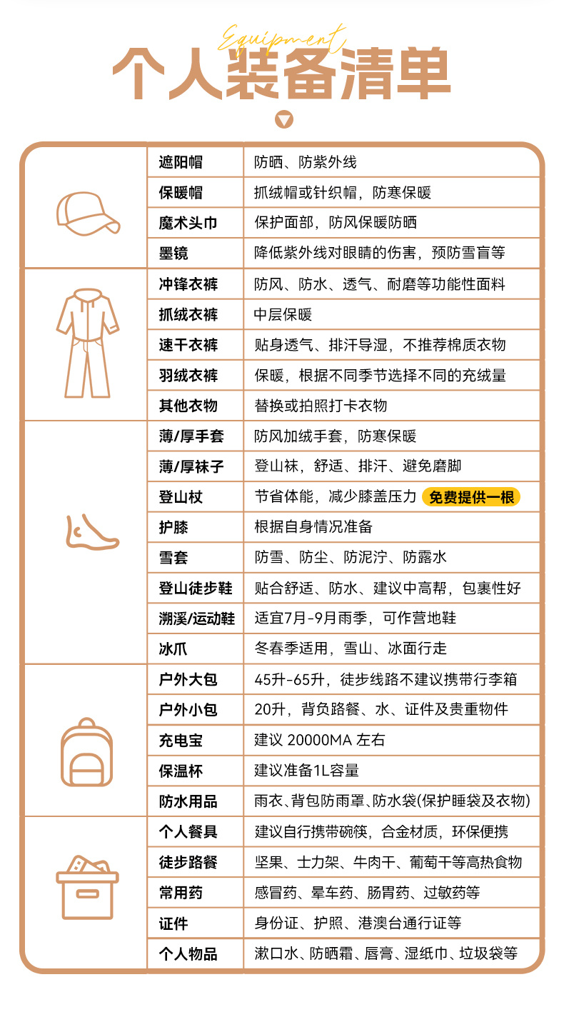 7.装备:燃料、炉具、炊具、部分餐具、通讯工具、睡眠系统等。