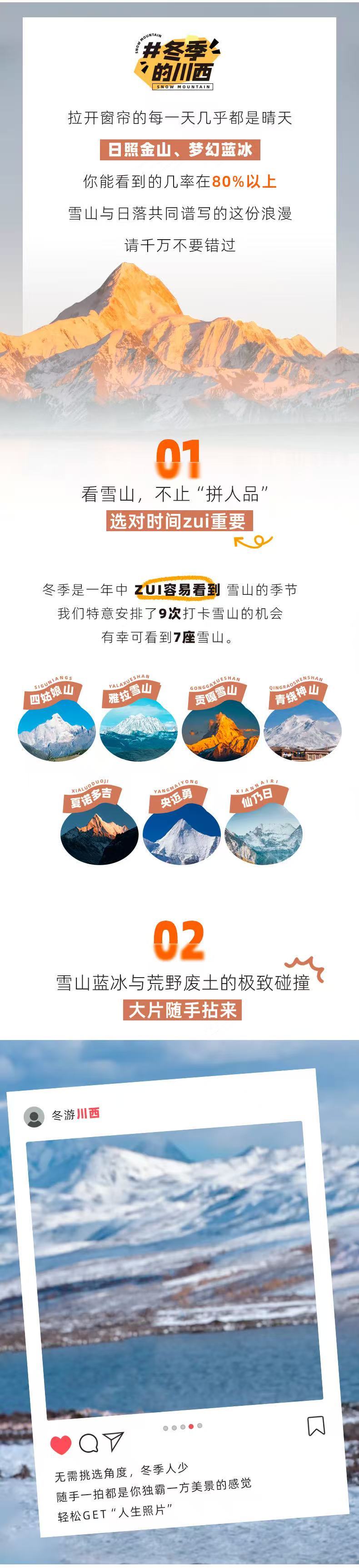 (4)冬季因冰雪天气影响,牛奶海、五色海会视情况封闭,不能游览,敬请见谅;当天游览线路参考:景区游客中心-景区观光车约1小时-扎灌崩-徒步0.5km-冲古寺-徒步1.5km-卓玛拉措(珍珠海)-仙乃日神山-原路返回至冲古服务区-观景车约20分钟-洛绒牛场(三怙主雪山)-有精力的可以继续徒步约2KM至贡嘎措-原路返回出景区。