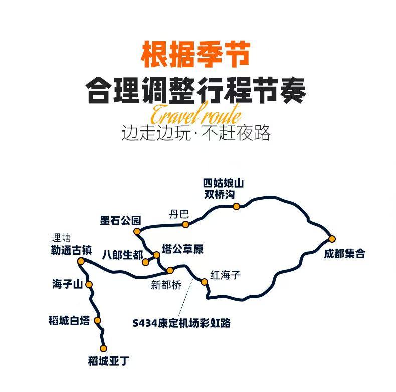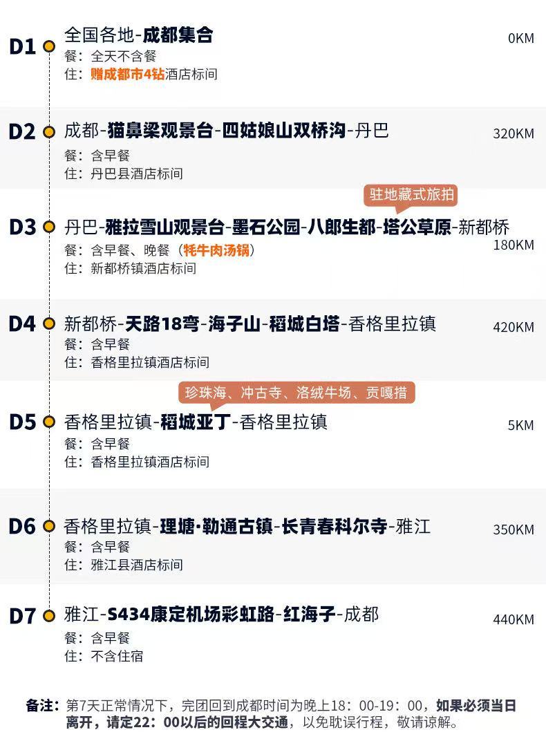 (1)以上行程时间安排可能会因天气、路况等原因做相应调整,正常情况下完团回到成都时间为晚上18:00-19:00,如果必须当日离开,请定22:00以后的回程大交通,以免耽误行程,敬请谅解;