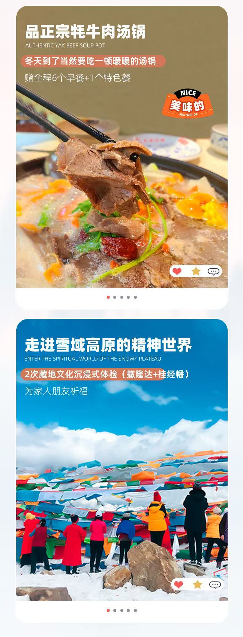 3、全程6个早餐+1个特色餐(牦牛肉汤锅),如队员另外点餐,需自己支付费用;