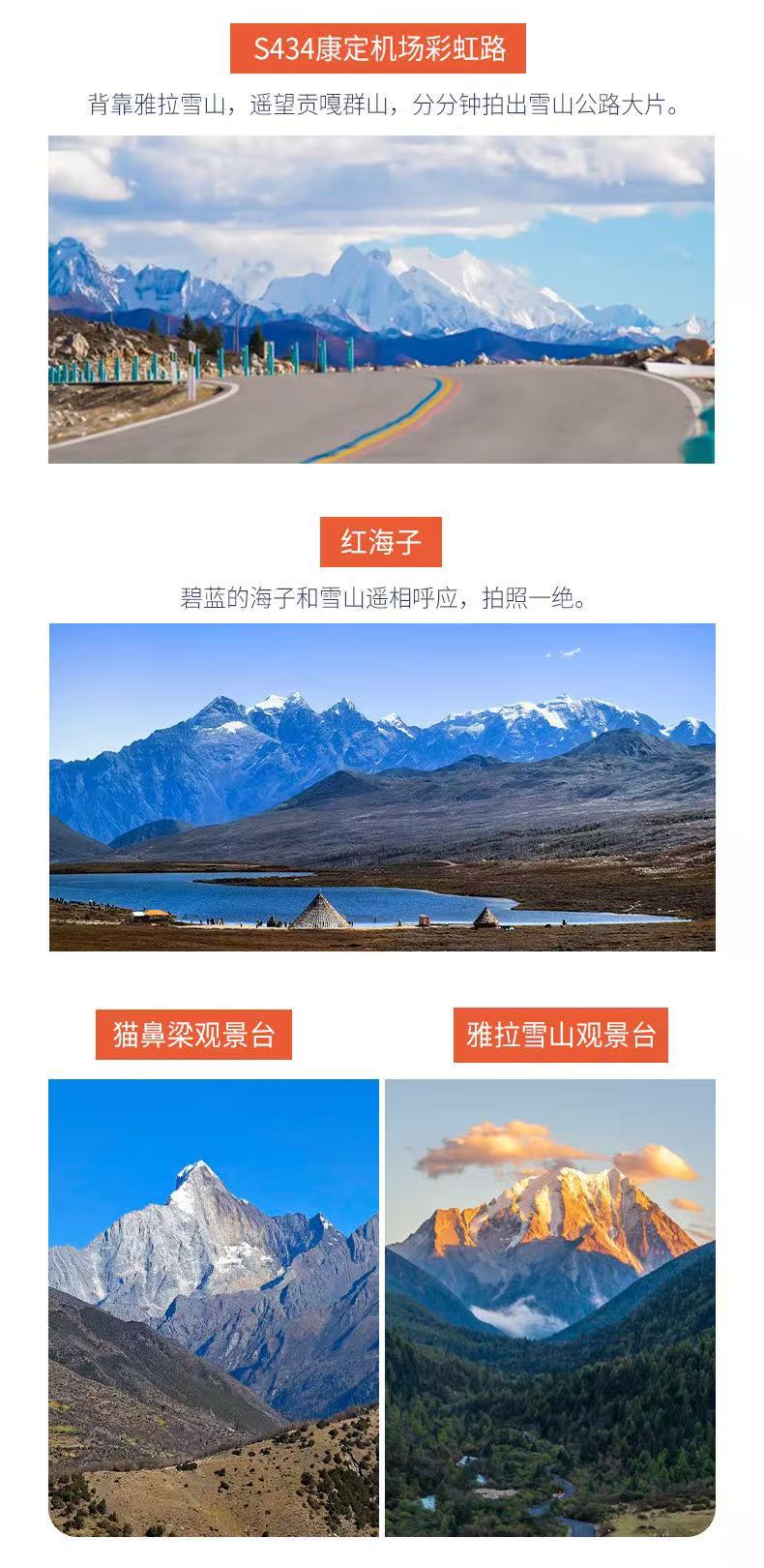 【行程概述】早餐后出发,途中会经过各大旅行博主的拍照圣地【康定机场彩虹公路】,这里背靠雅拉雪山,遥望贡嘎群山,分分钟拍出雪山公路大片,惊艳朋友圈。而后抵达一处秘境海子--【红海子(加呷腊)】,这里可以包揽整个湖泊和雪山。晴天,可以看到笔架山(5880M)、田海子峰(6080M)等一众雪山,拍照更是一绝,海子和雪山遥相呼应,怎么拍都好看。游玩后我们朝着甘孜藏族自治州首府——《康定情歌》中的康定行进,随后上【雅康高速】,穿越二郎山隧道,感受阴阳两重天,经雨城雅安上成雅高速返回成都。