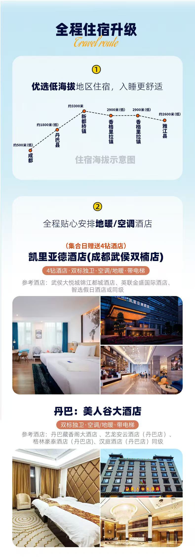 4、景交:稻城亚丁观光车120元/人(必须)、稻城亚丁观景车70元/往返(可选),墨石公园观光车20元/人(必须),四姑娘山双桥沟观光车70元/人(必须),红海子清洁费30元/人(可选),八郎生都清洁费30元/人(必须);
