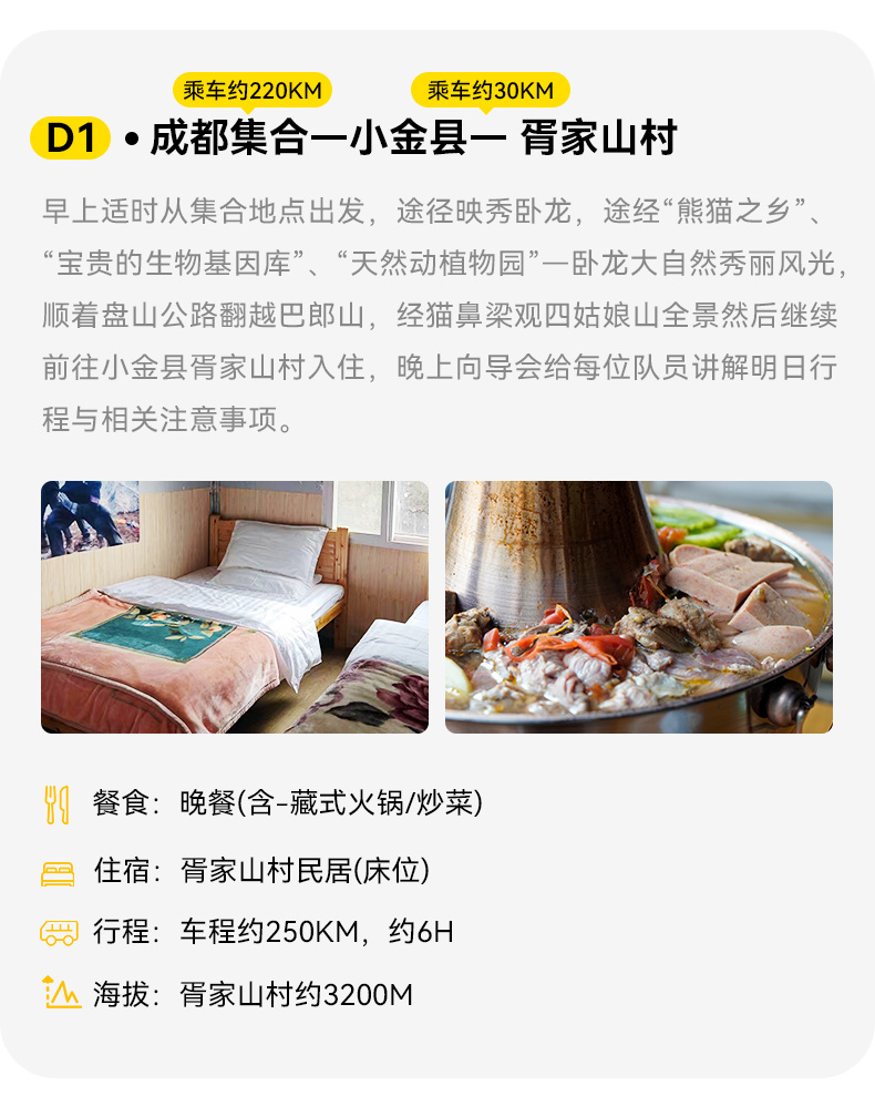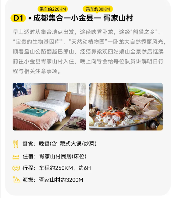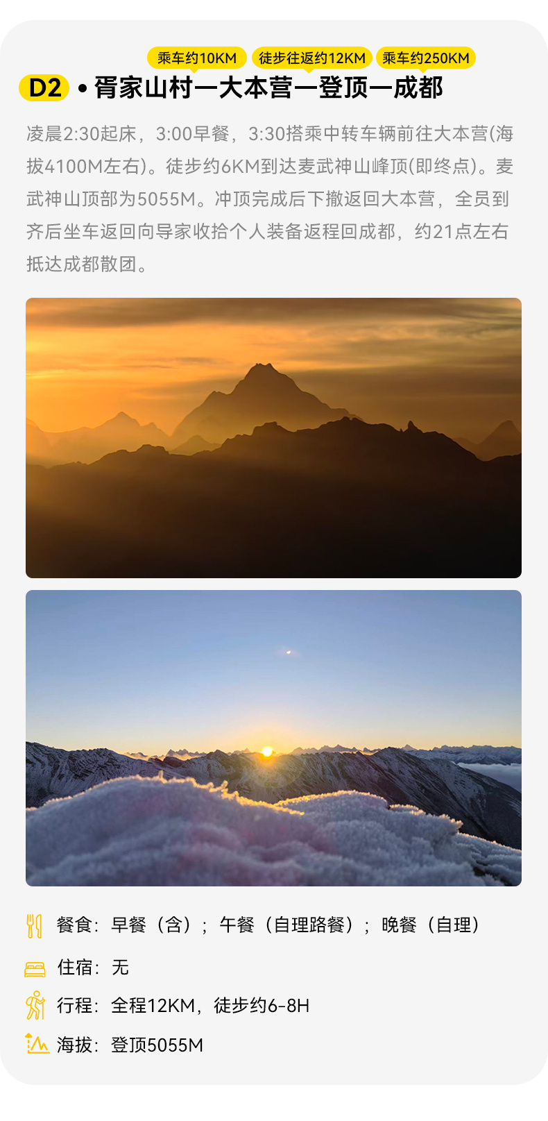 1.交通:成都出发根据人数选择合适车型,一人一座,胥家山村-麦武神山大本营中转车。