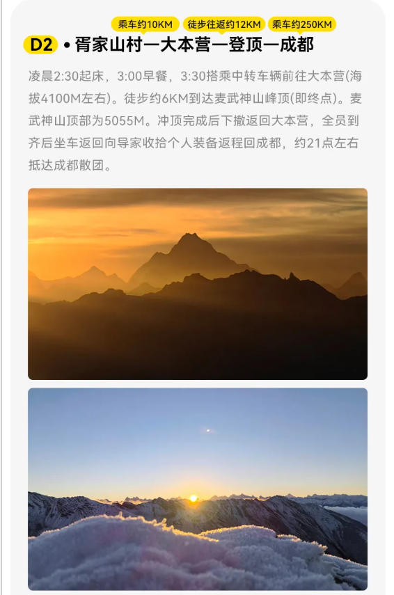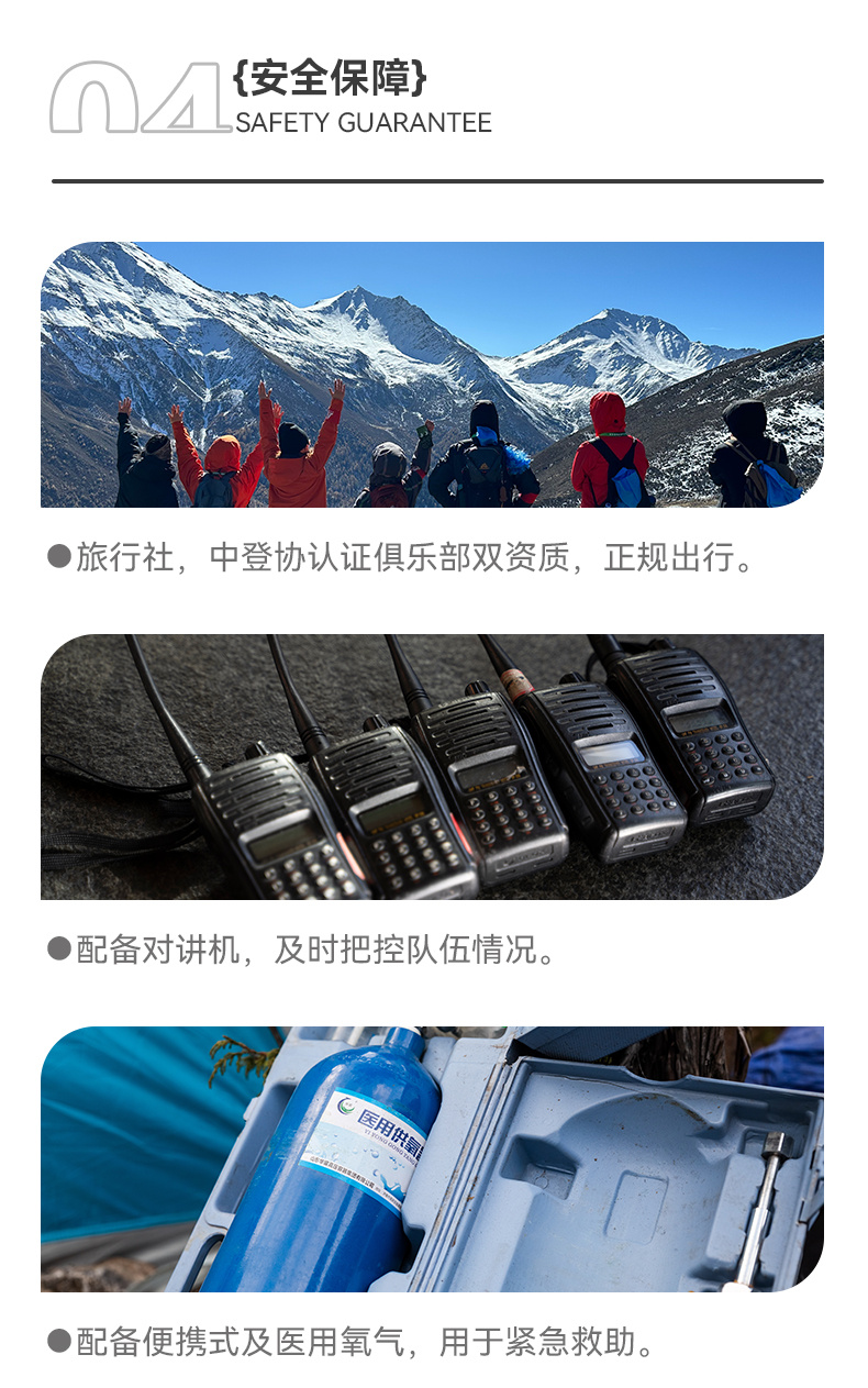 4.向导:专业登山向导带队,10人以上配专业高山领队全程跟队。