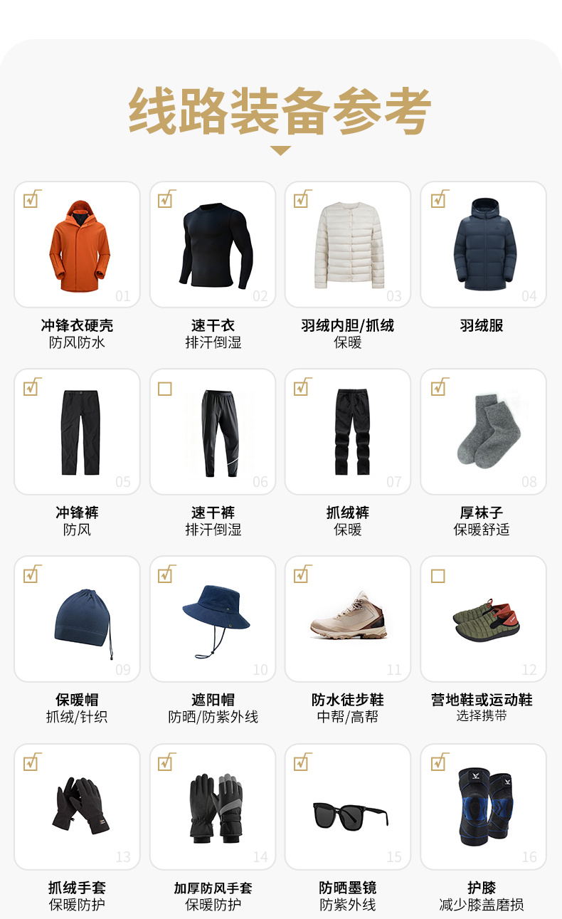 提供装备使用:冰爪+雪套+登山杖+头灯(需自备电池)。